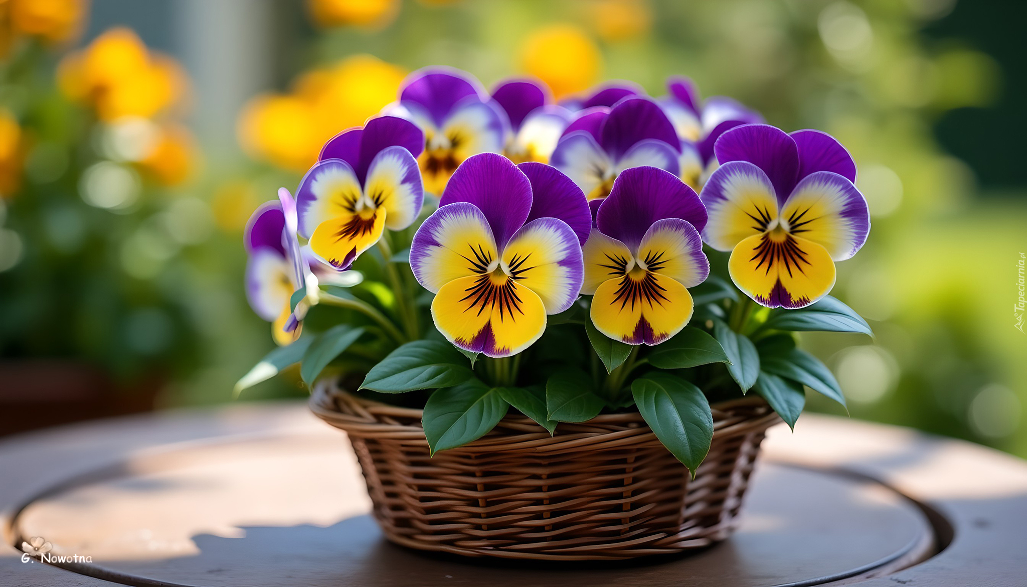 Edytor tapety: Koszyk z żółto-fioletowymi bratkami na okrągłym stole