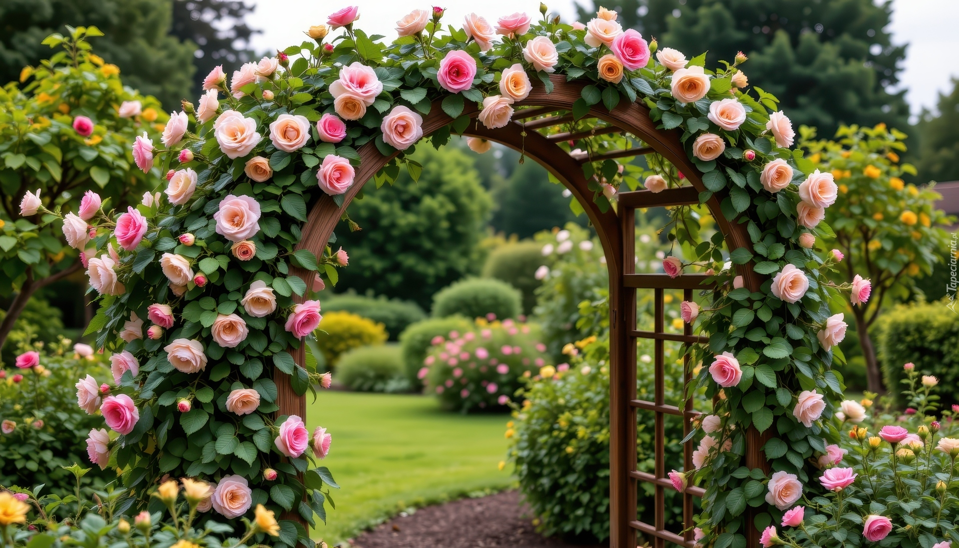Edytor tapety: Pnące róże na pergoli ogrodowej