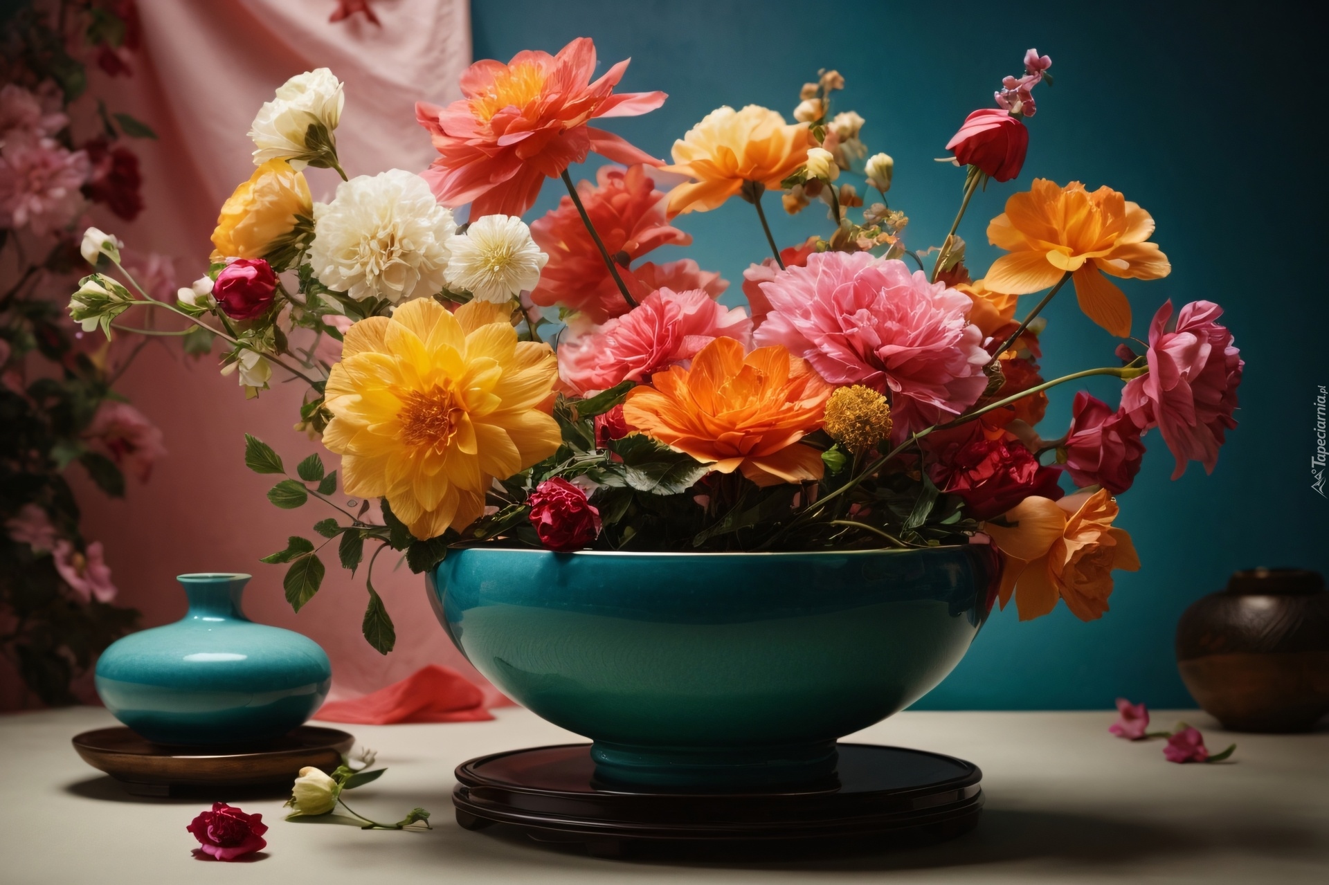 Edytor tapety: Kolorowe kwiaty w niebieskiej wazie