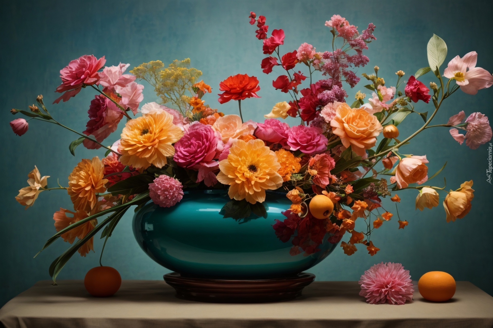 Edytor tapety: Waza z bukietem kolorowych kwiatów na stole