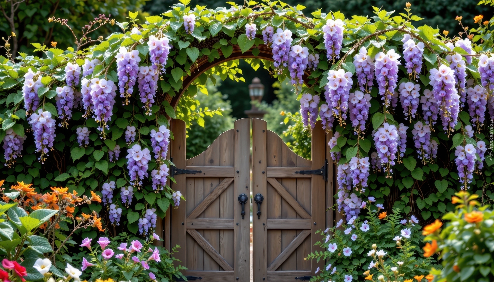 Edytor tapety: Glicynia nad drewnianą bramą w ogrodzie