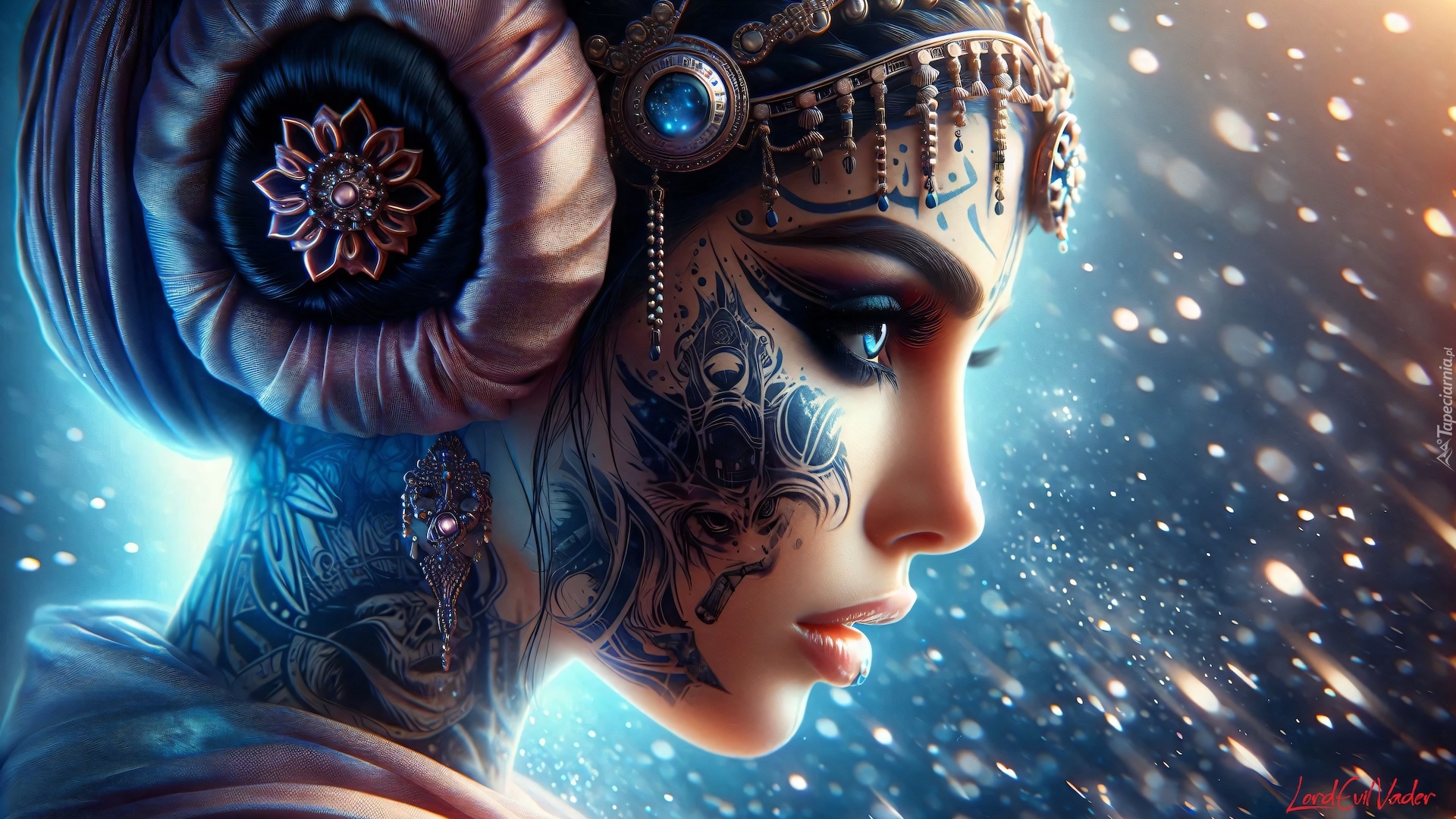 Edytor tapety: Twarz kobiety z profilu z tatuażem i biżuterią