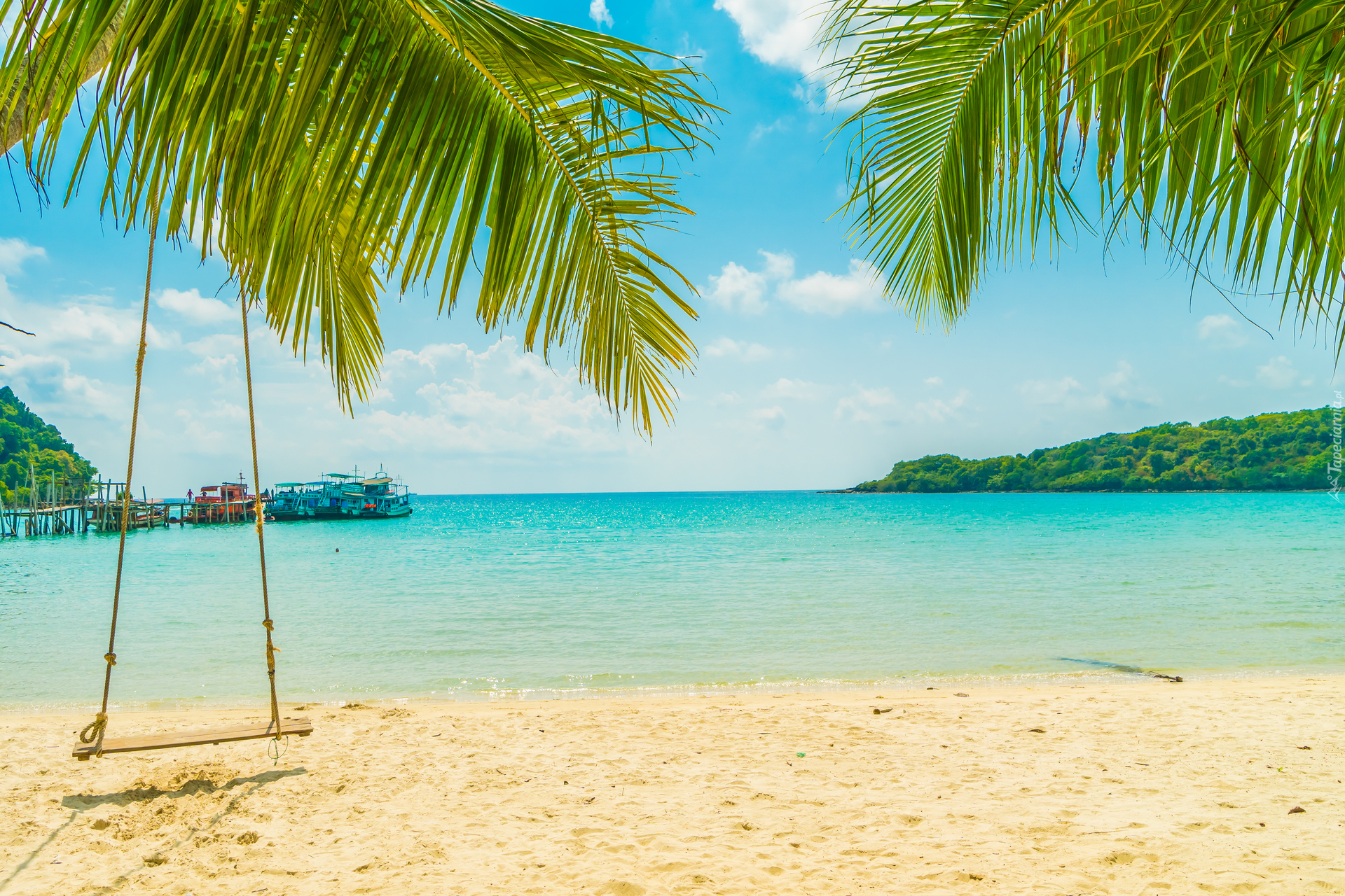 Edytor tapety: Huśtawka i palmy na plaży nad brzegiem morza