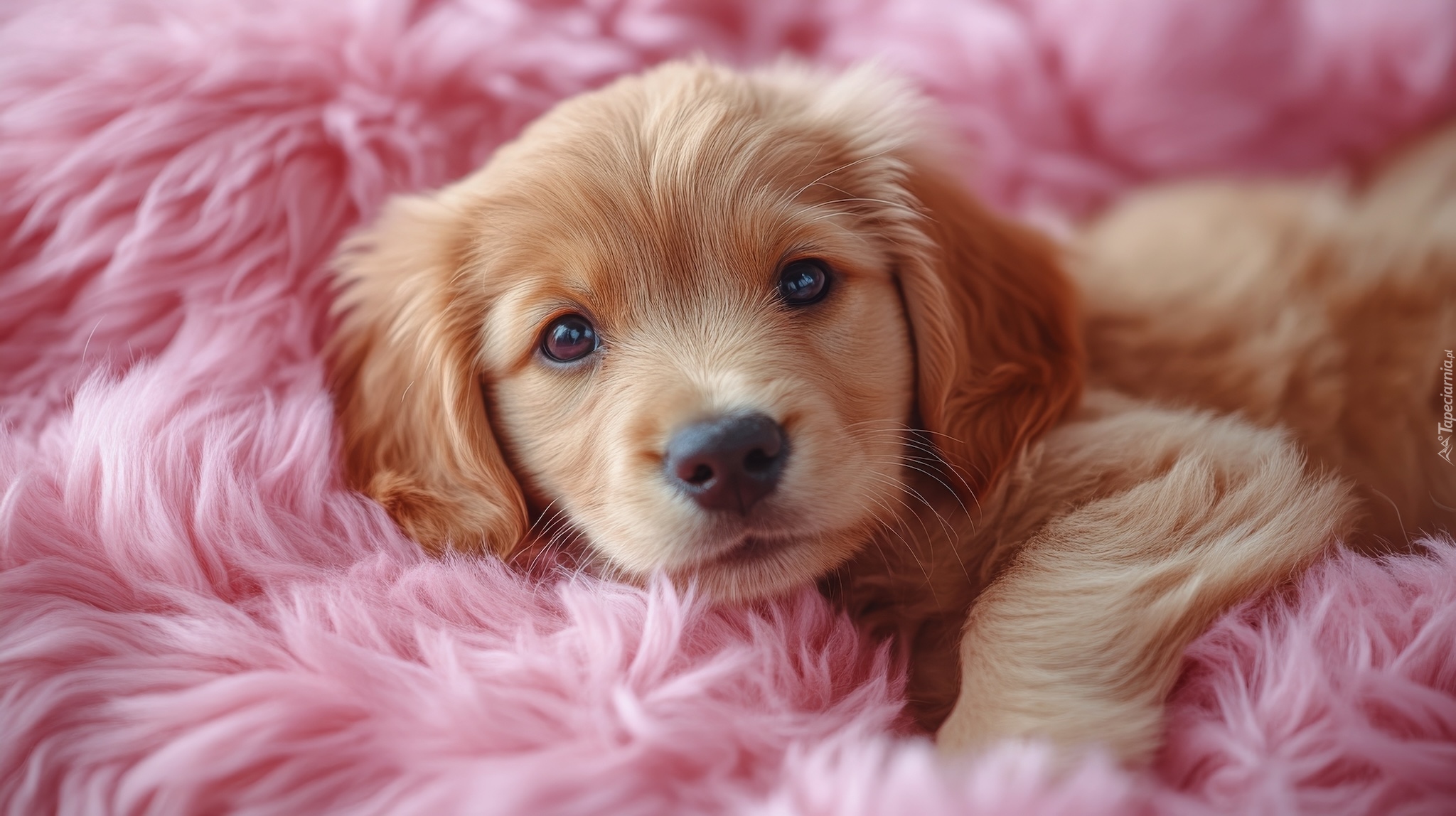 Edytor tapety: Brązowy szczeniak leżący na różowym włochatym kocu