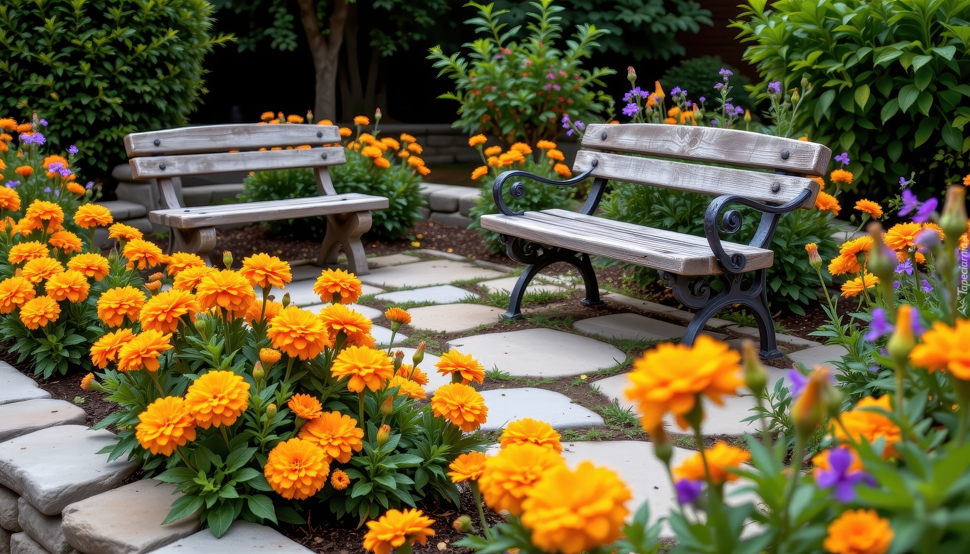 Edytor tapety: Dwie ławki otoczone aksamitkami w ogrodzie