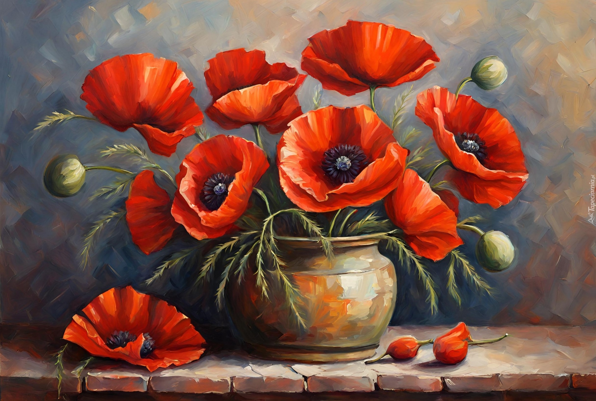 Edytor tapety: Czerwone maki z pąkami w wazonie