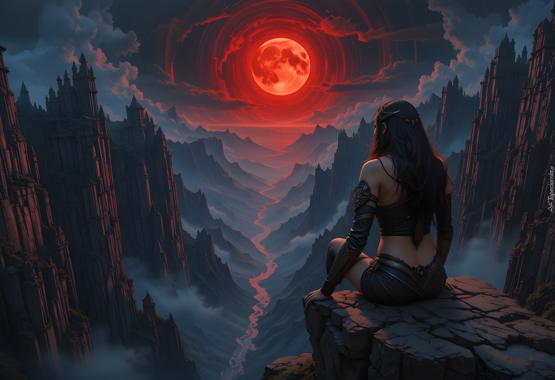Edytor tapety: Księżyc nad górami i wojowniczka siedząca na skale