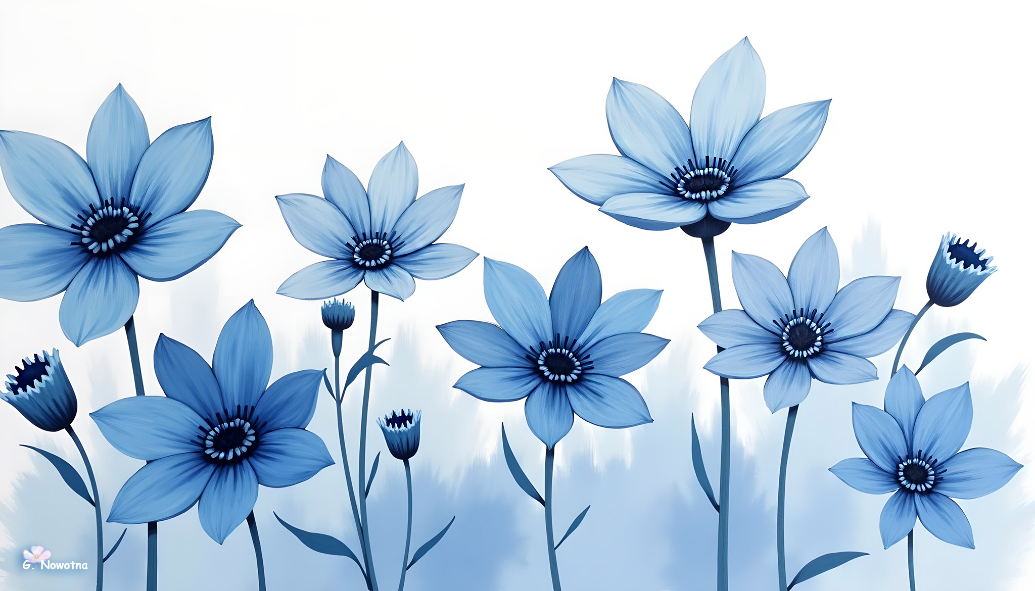 Edytor tapety: Niebieskie kwiaty z pąkami na jasnym tle