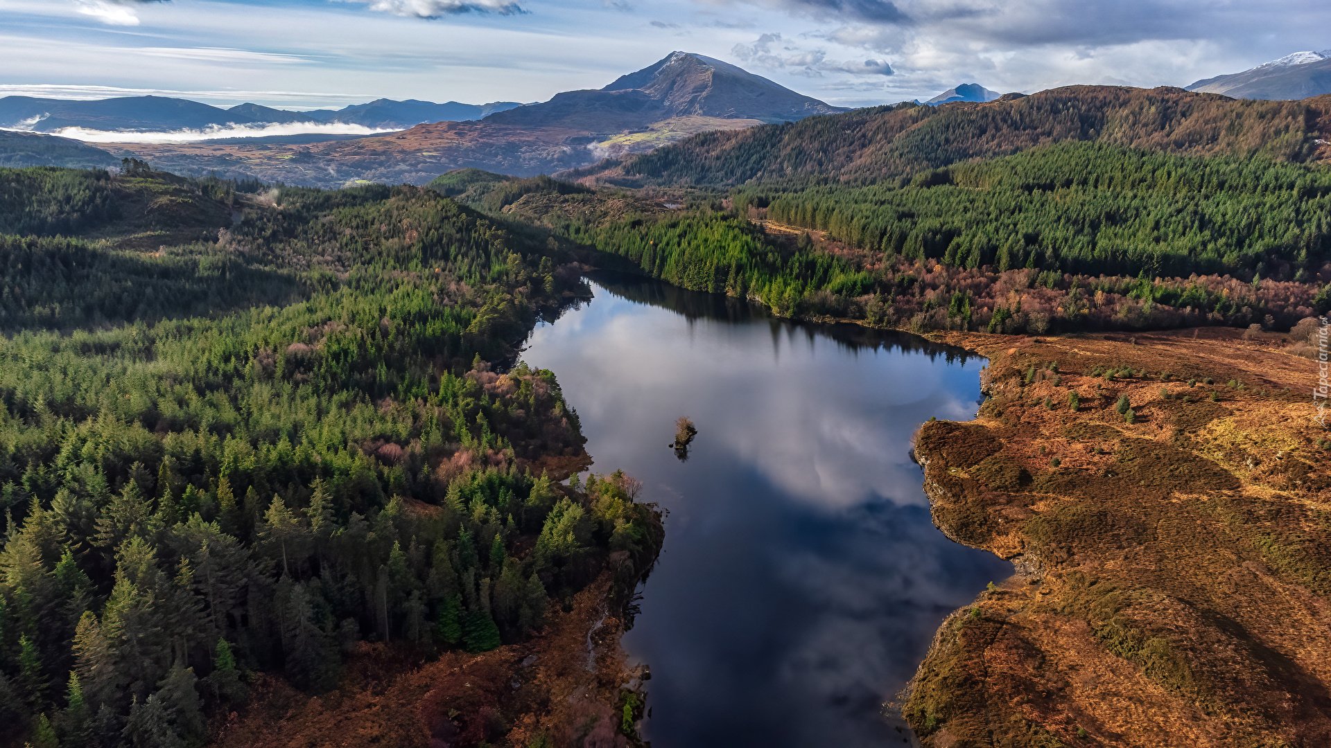 Edytor tapety: Lasy nad jeziorem i góry w oddali
