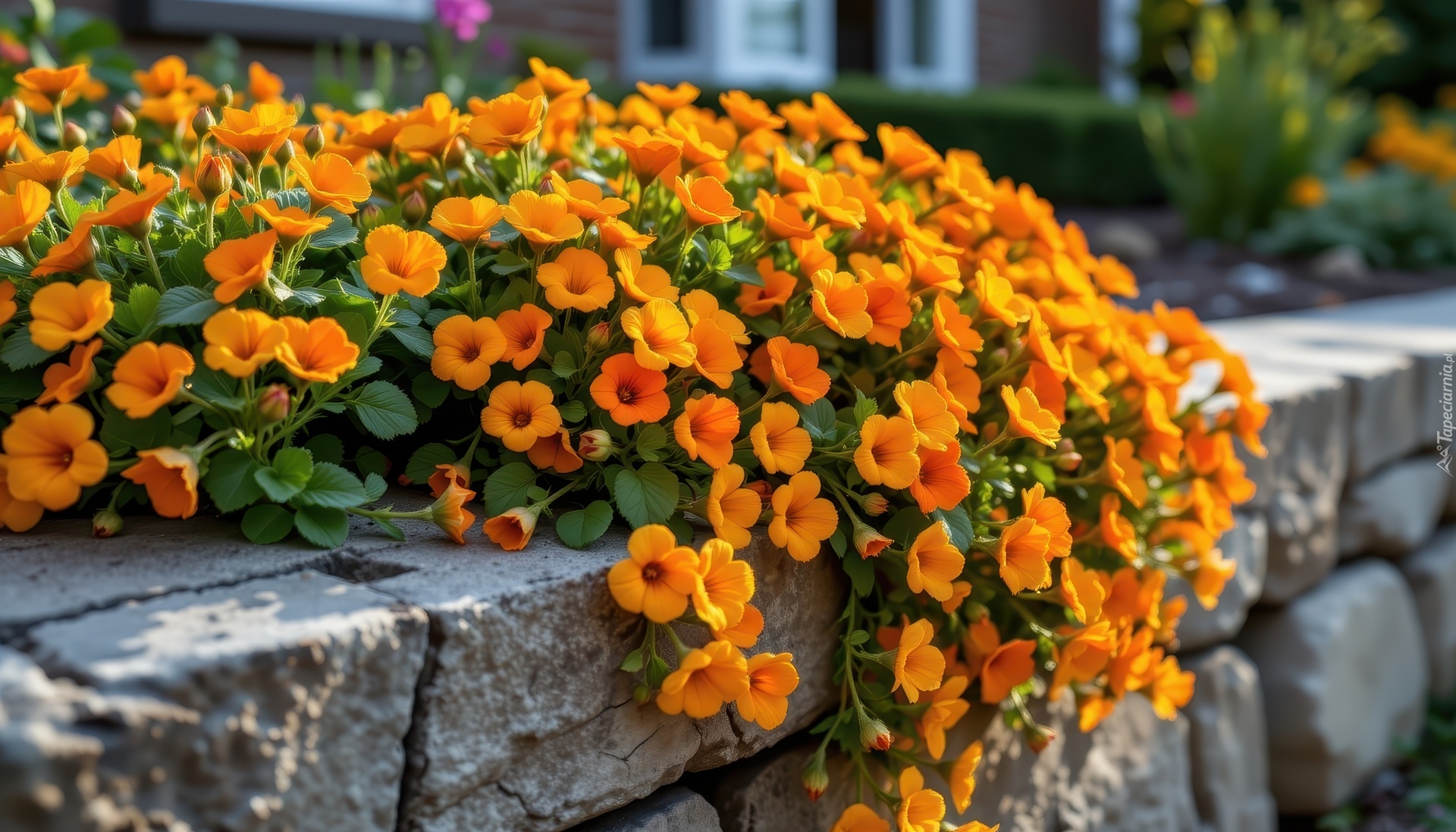 Edytor tapety: Pomarańczowe zwisające kwiaty na murze