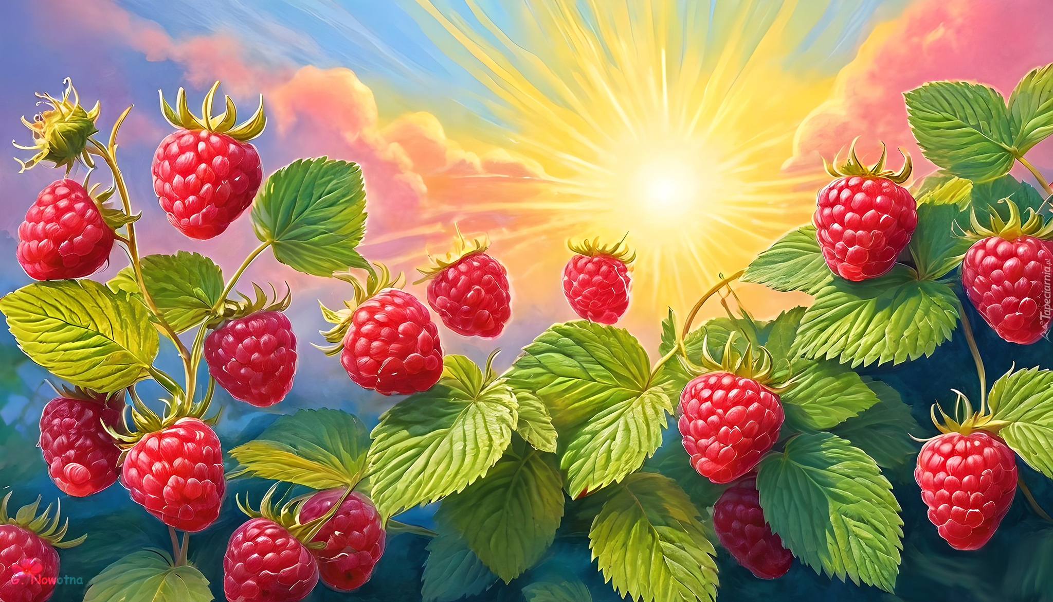 Edytor tapety: Czerwone maliny z liśćmi w promieniach słońca