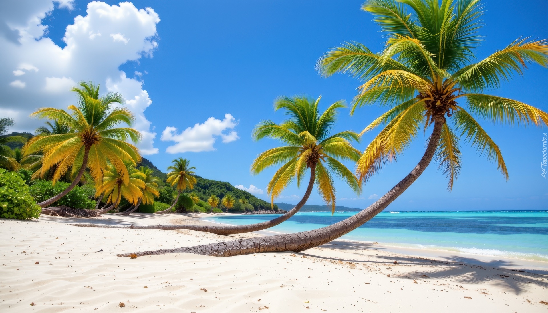 Edytor tapety: Pochylone palmy na plaży nad brzegiem morza