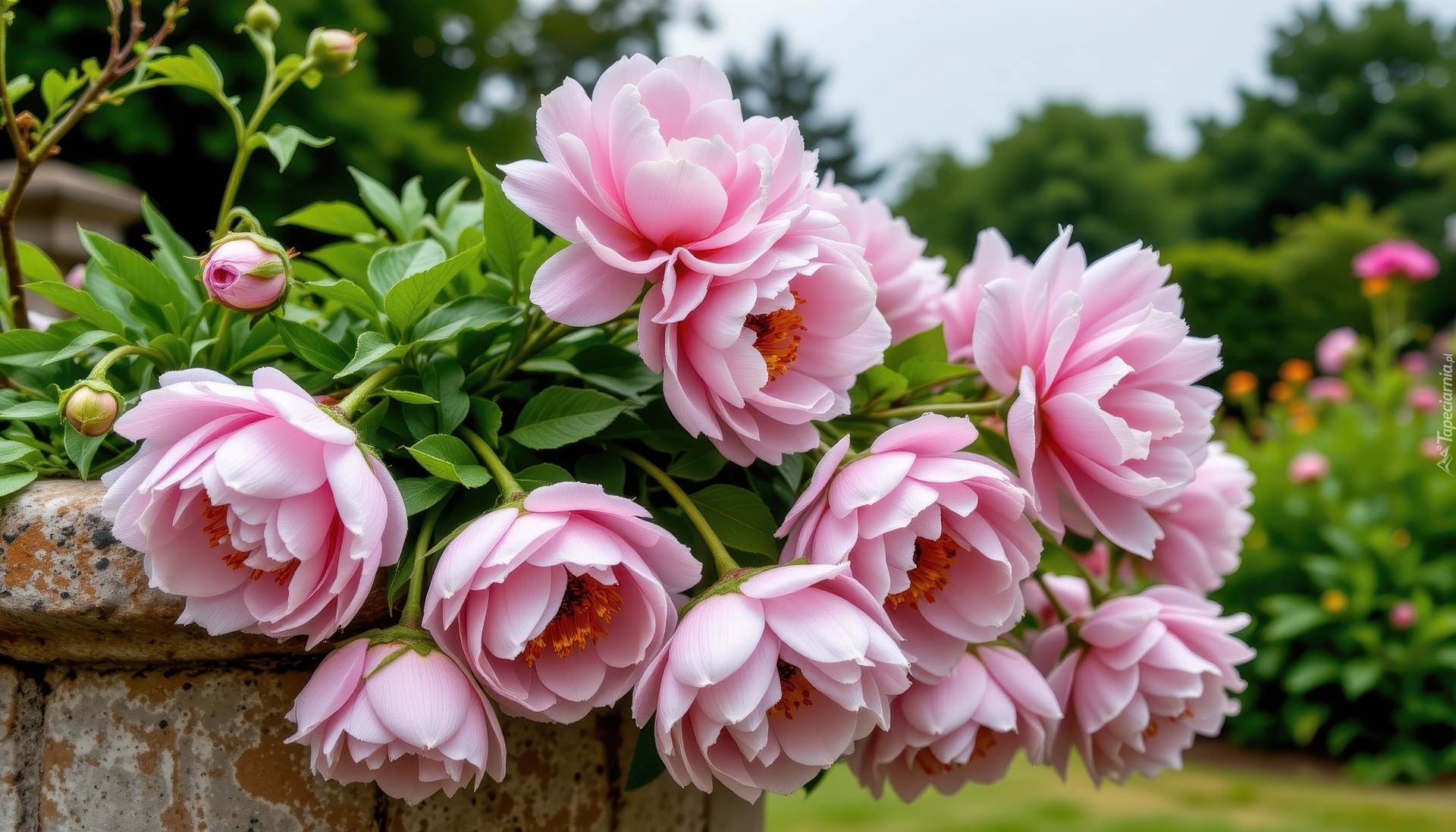 Edytor tapety: Rozkwitnięte jasnoróżowe piwonie na murze w ogrodzie