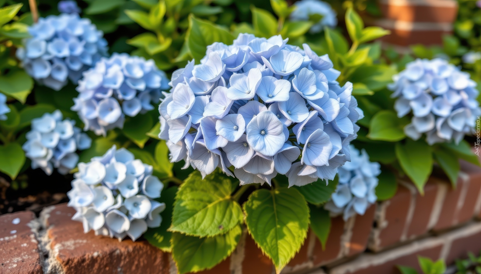 Edytor tapety: Niebieskie hortensje przy murku z cegieł