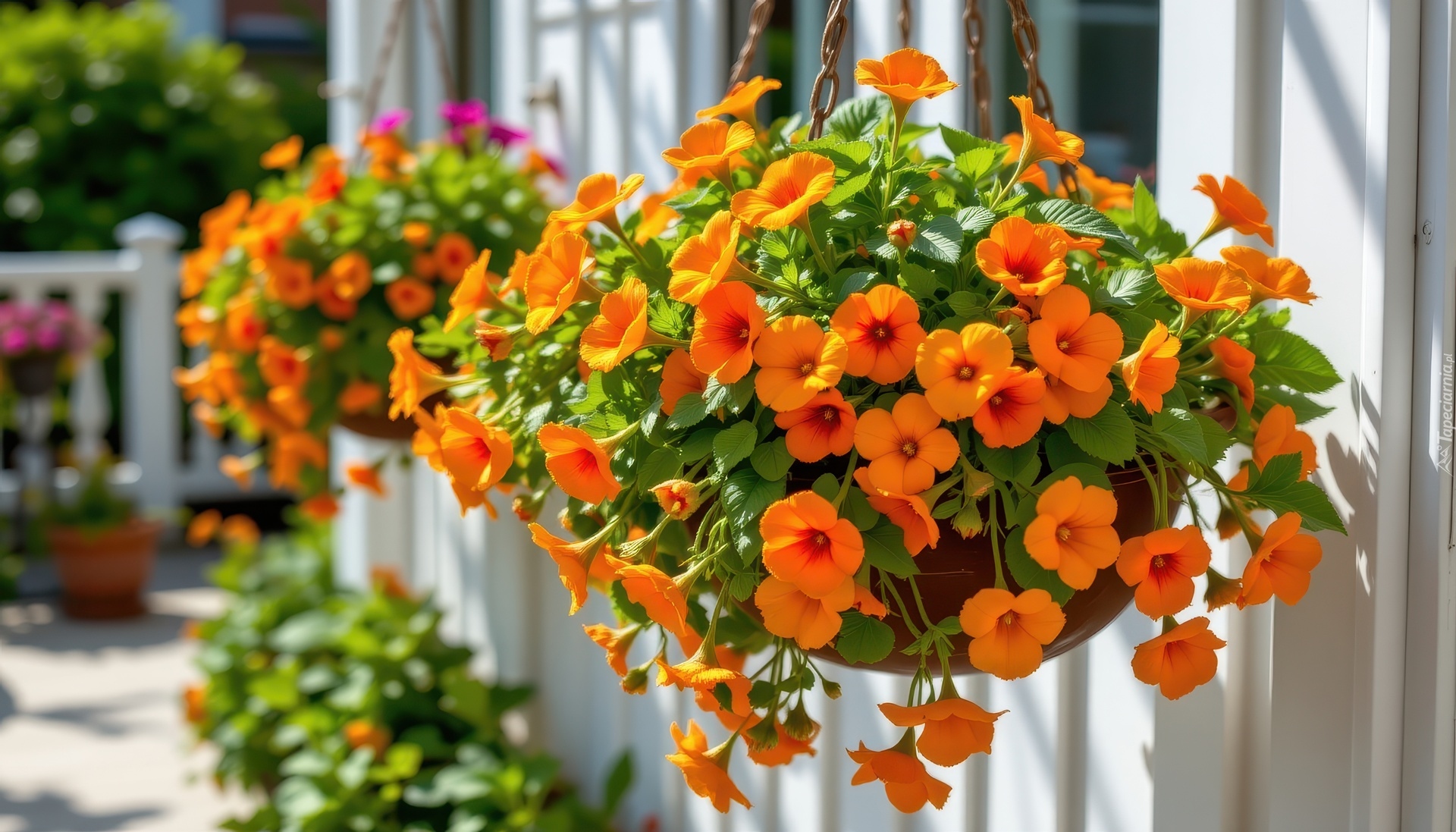 Edytor tapety: Rozświetlone pomarańczowe kwiaty w wiszących doniczkach