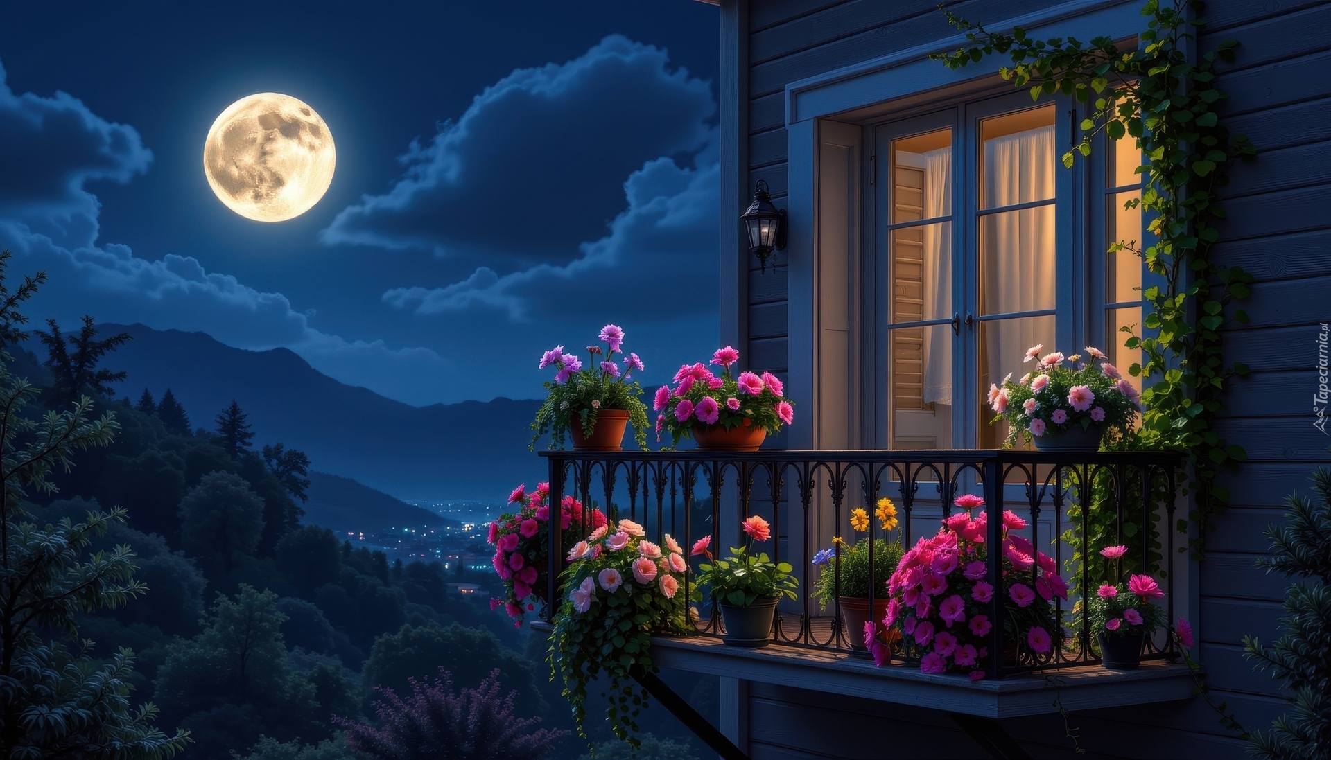 Edytor tapety: Kwiaty w doniczkach na balkonie w księżycowym blasku