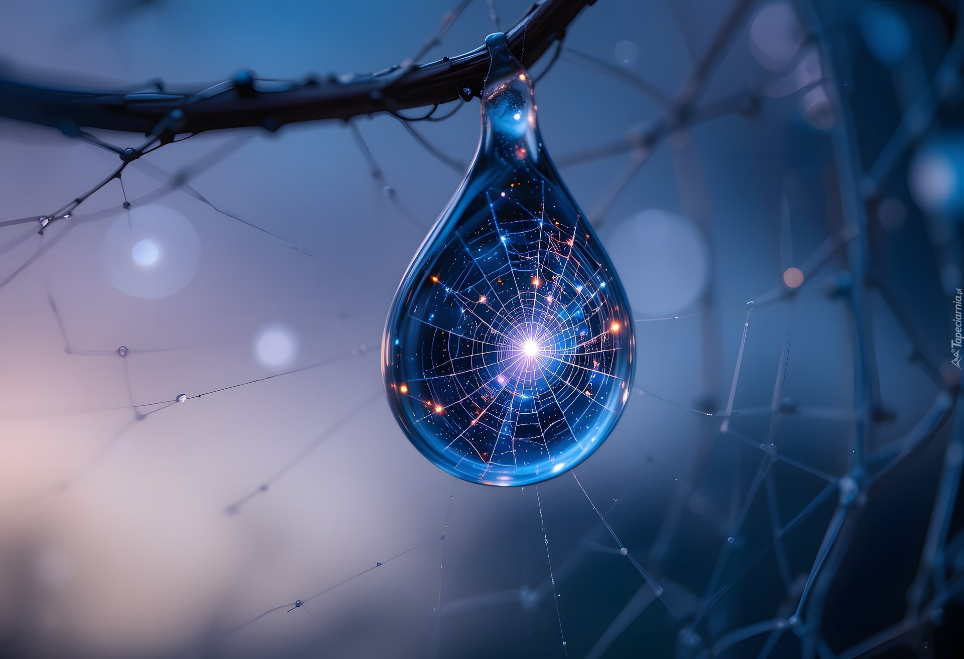 Edytor tapety: Rozświetlona światłem kropla wody na gałęzi