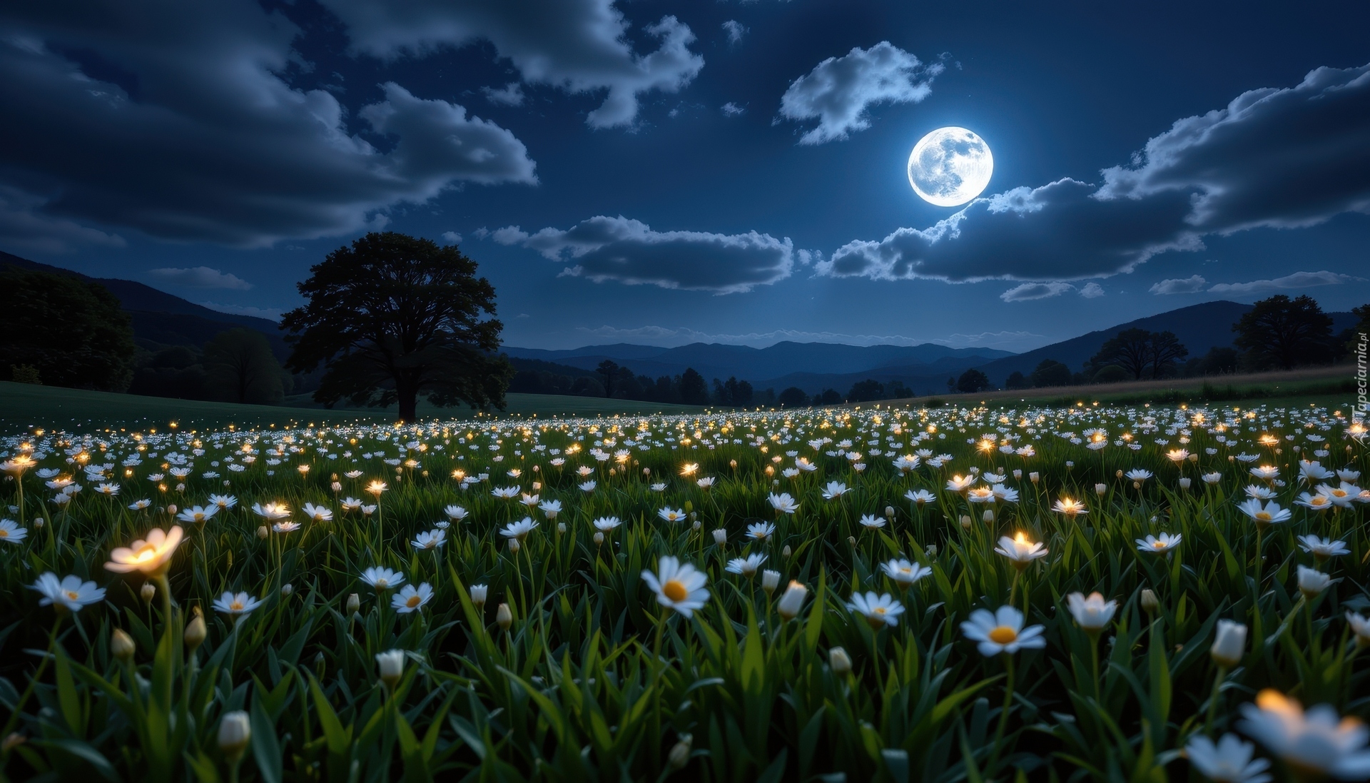 Edytor tapety: Białe kwiaty na łące w księżycowym blasku