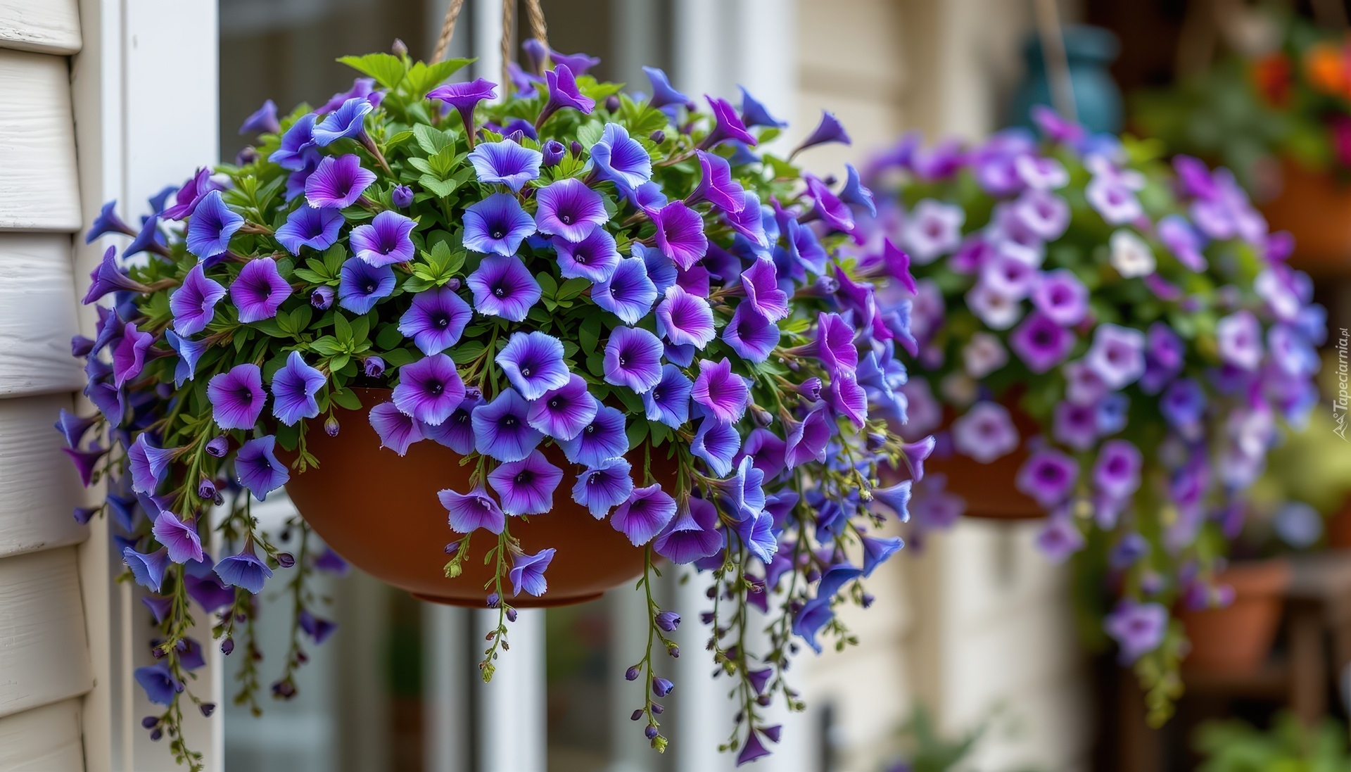 Edytor tapety: Kwiaty petunii w wiszących doniczkach