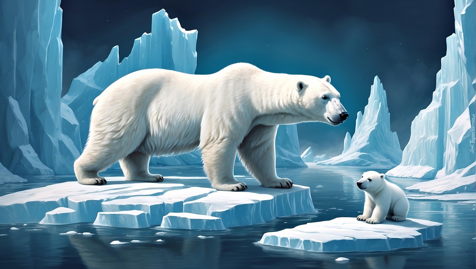 Edytor tapety: Niedźwiedź polarny z małym niedźwiadkiem na krach lodowych