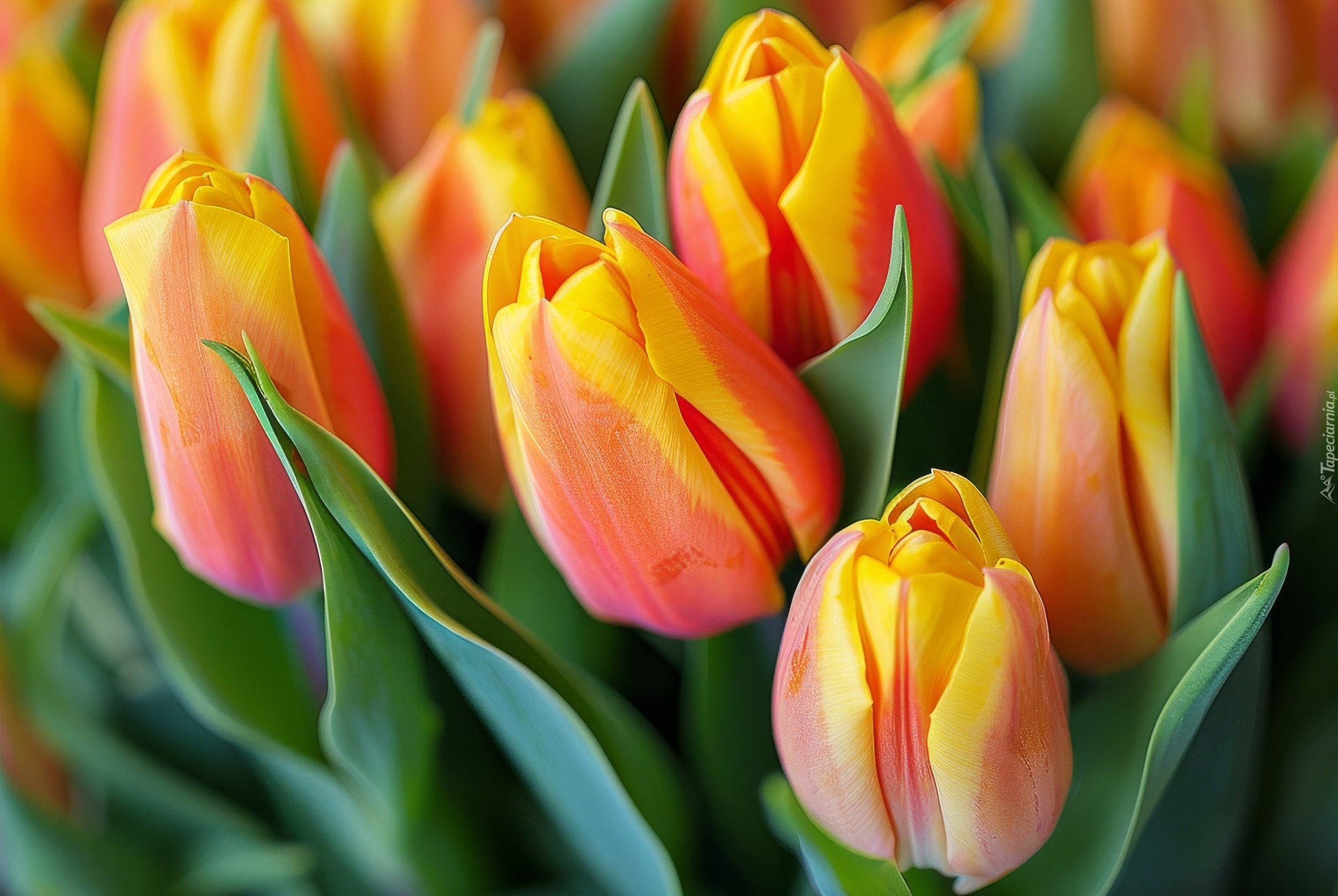 Edytor tapety: Żółto-czerwone tulipany z liśćmi w zbliżeniu