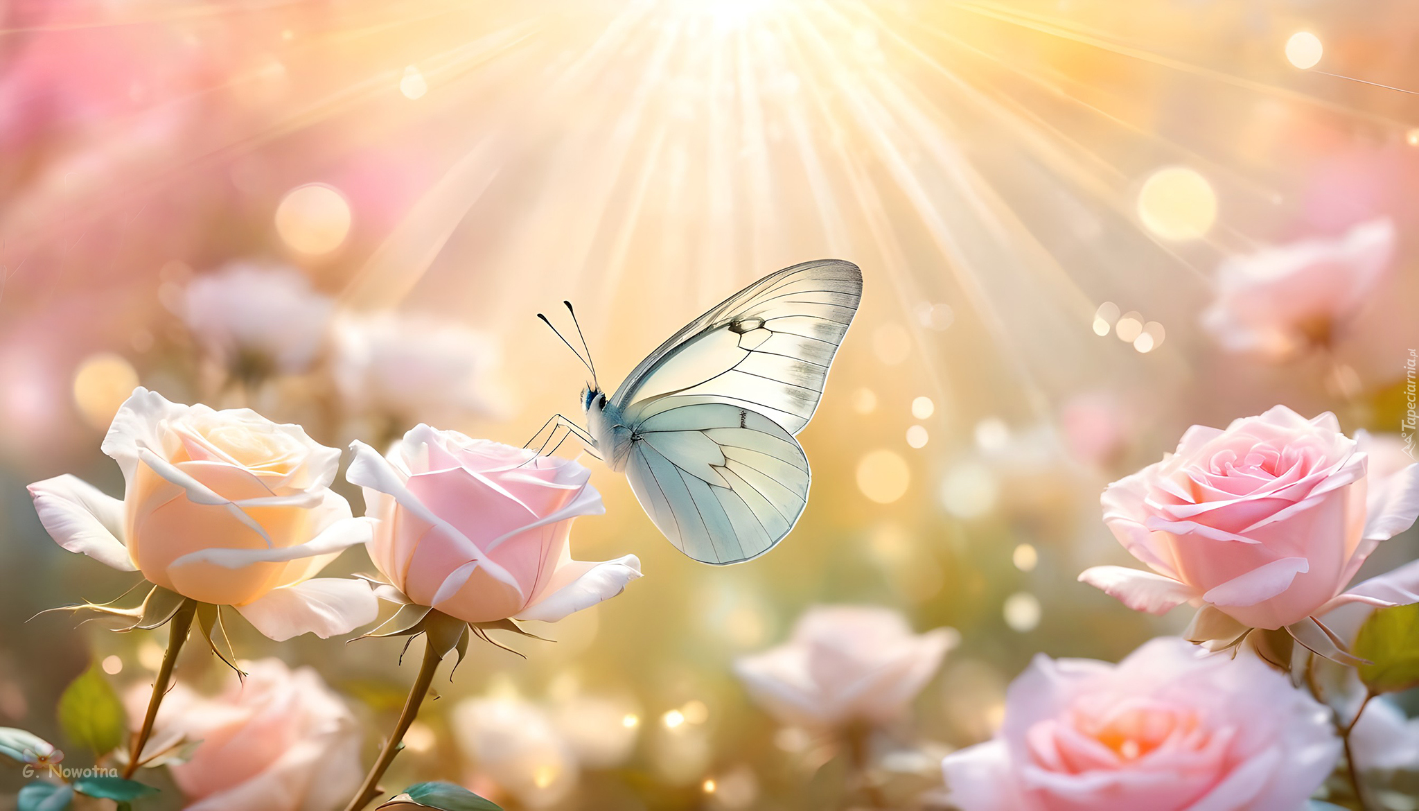 Edytor tapety: Biały motyl na jasnoróżowej róży w promieniach słońca