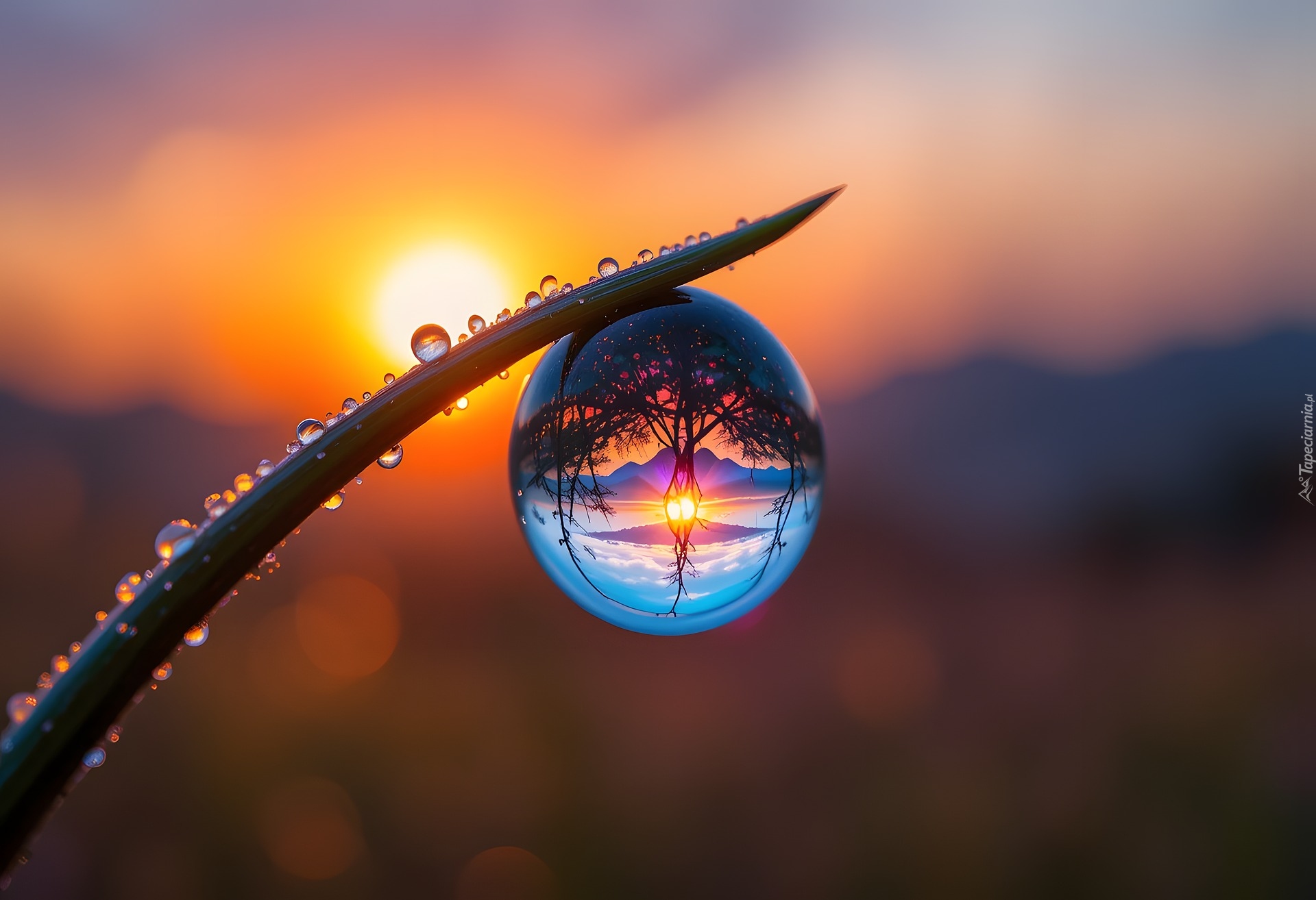Edytor tapety: Duża kropla wody na liściu w blasku światła