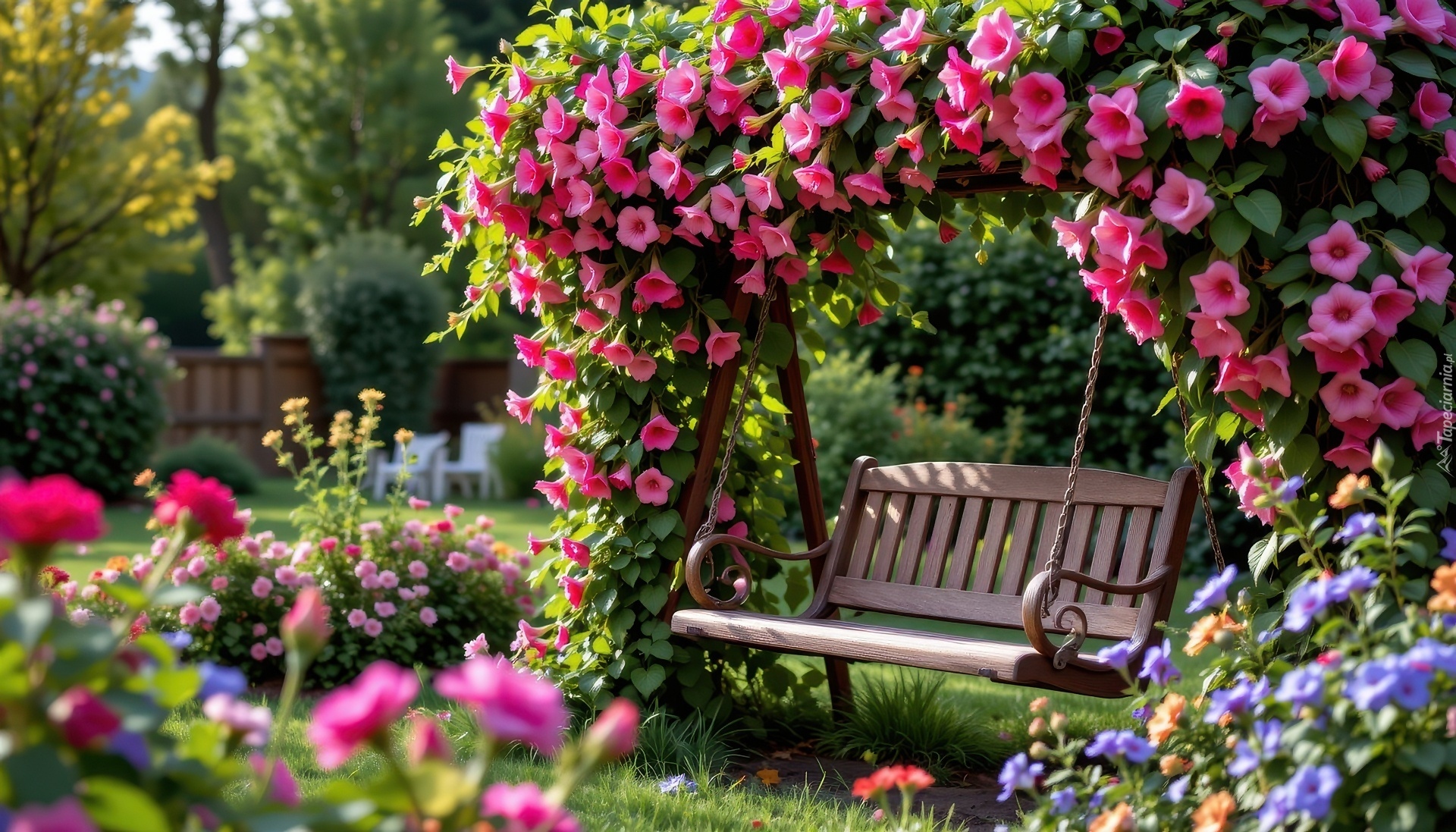 Edytor tapety: Huśtawka pod ukwieconą pergolą