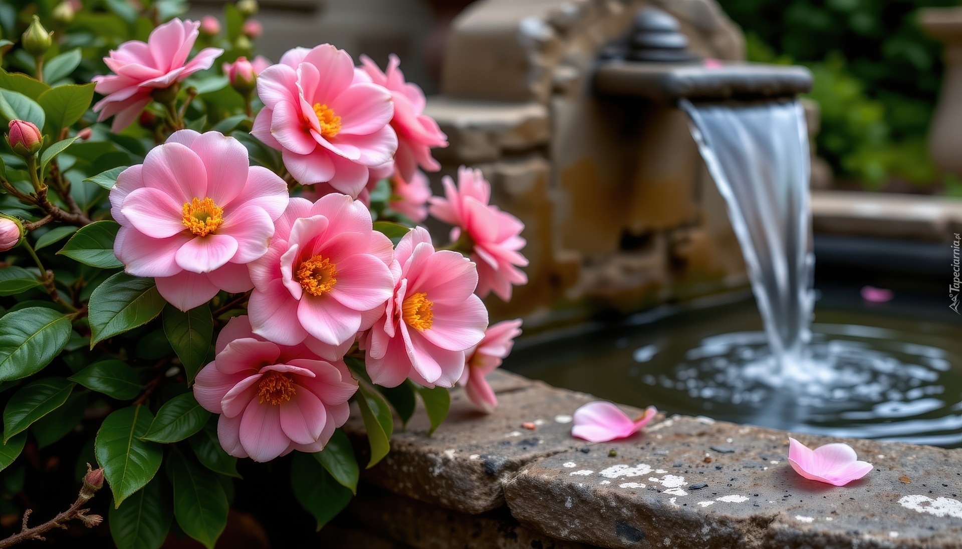 Edytor tapety: Różowe kwiaty przy fontannie