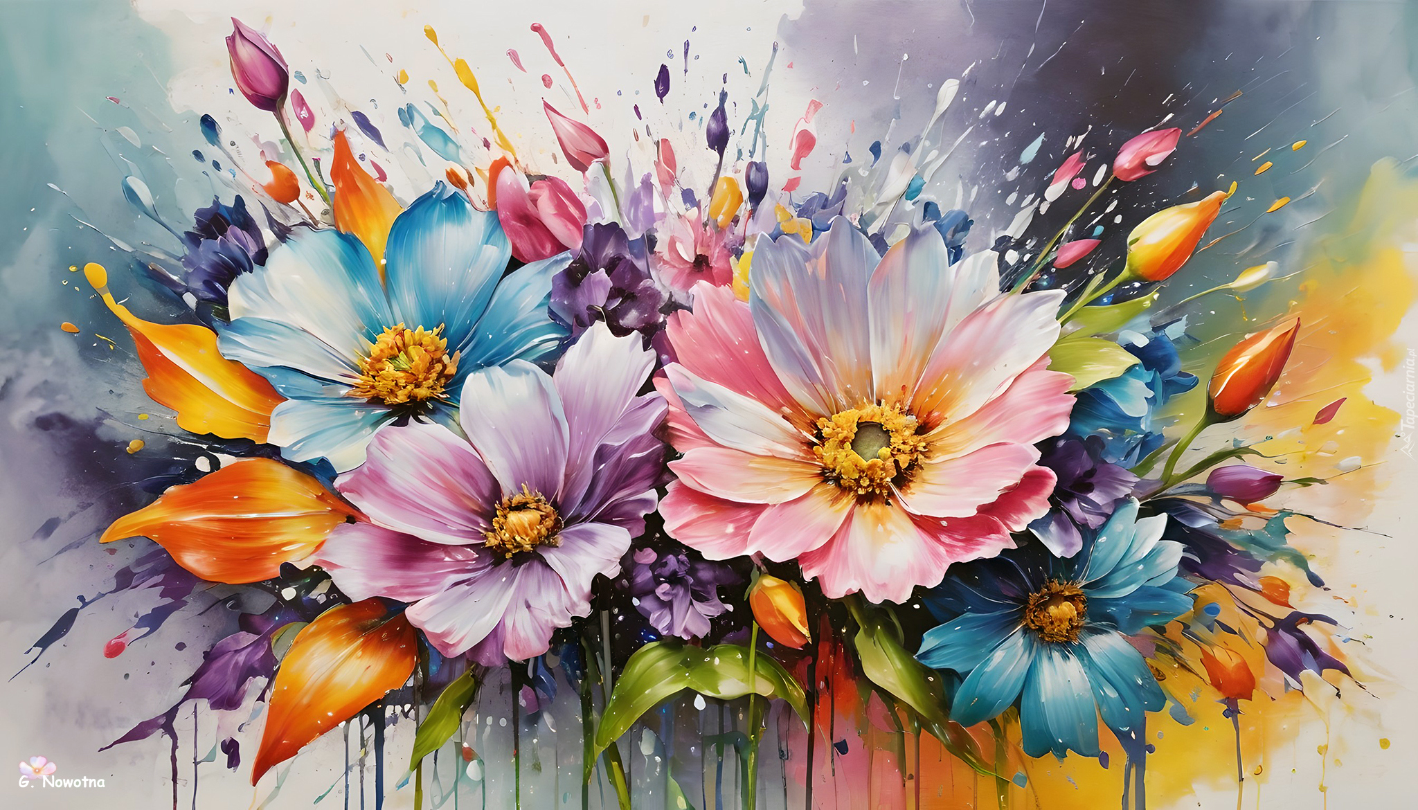 Edytor tapety: Kolorowe rozwinięte kwiaty z pąkami na kolorowym tle