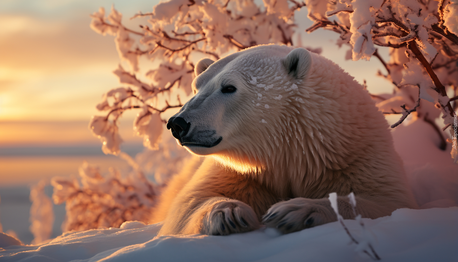 Edytor tapety: Niedźwiedź polarny leżący na śniegu pod krzewem