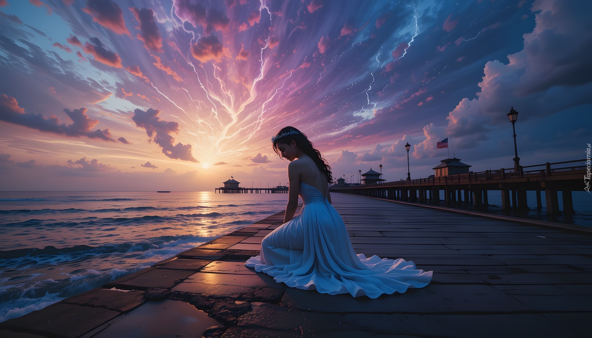 Edytor tapety: Dziewczyna siedząca na kamiennym nabrzeżu przy zachodzie słońca