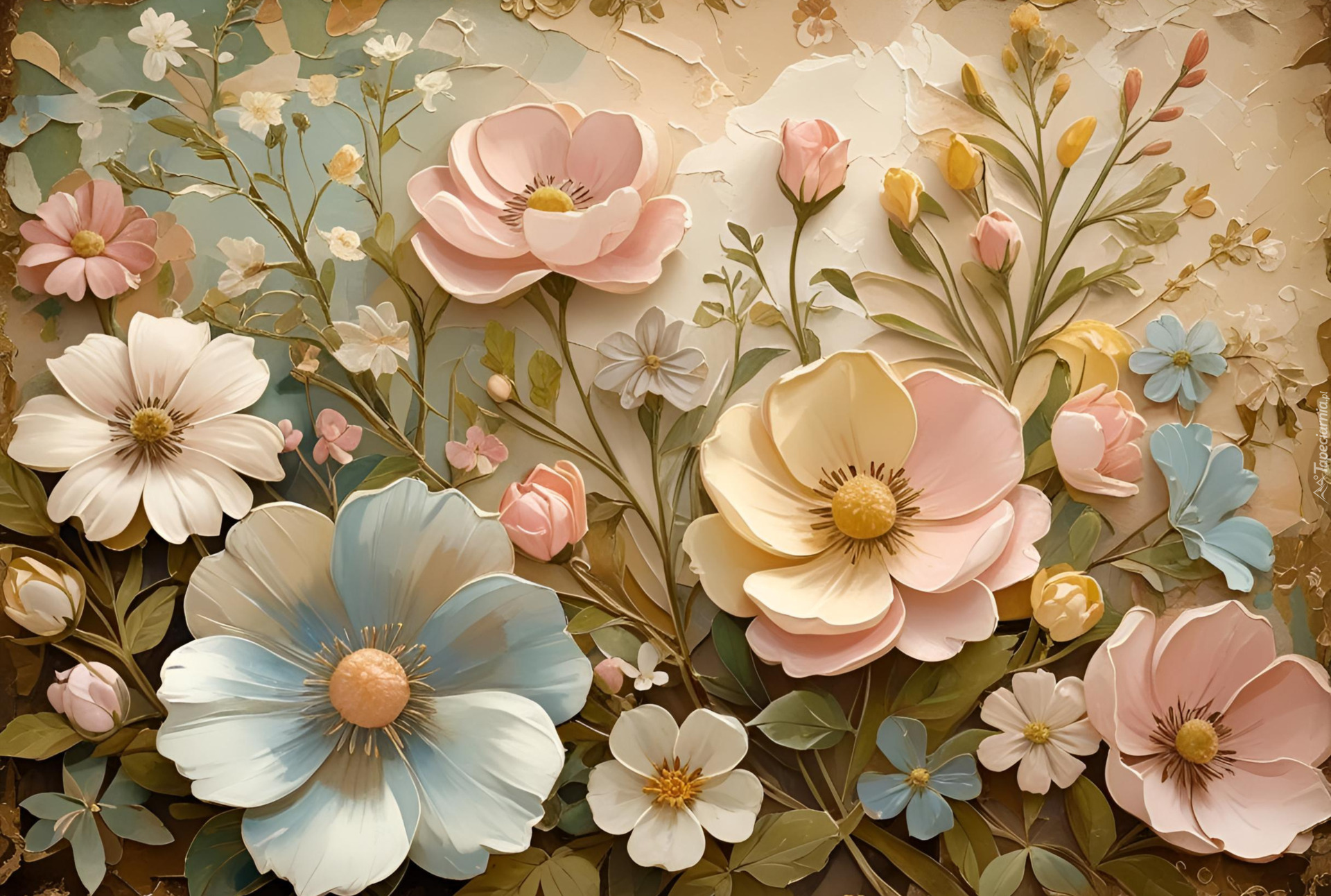 Edytor tapety: Duże i małe kwiaty na łodygach w grafice