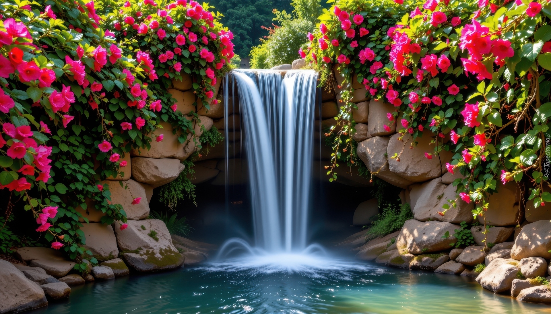 Edytor tapety: Pnącza i różowe kwiaty na skałach przy wodospadzie