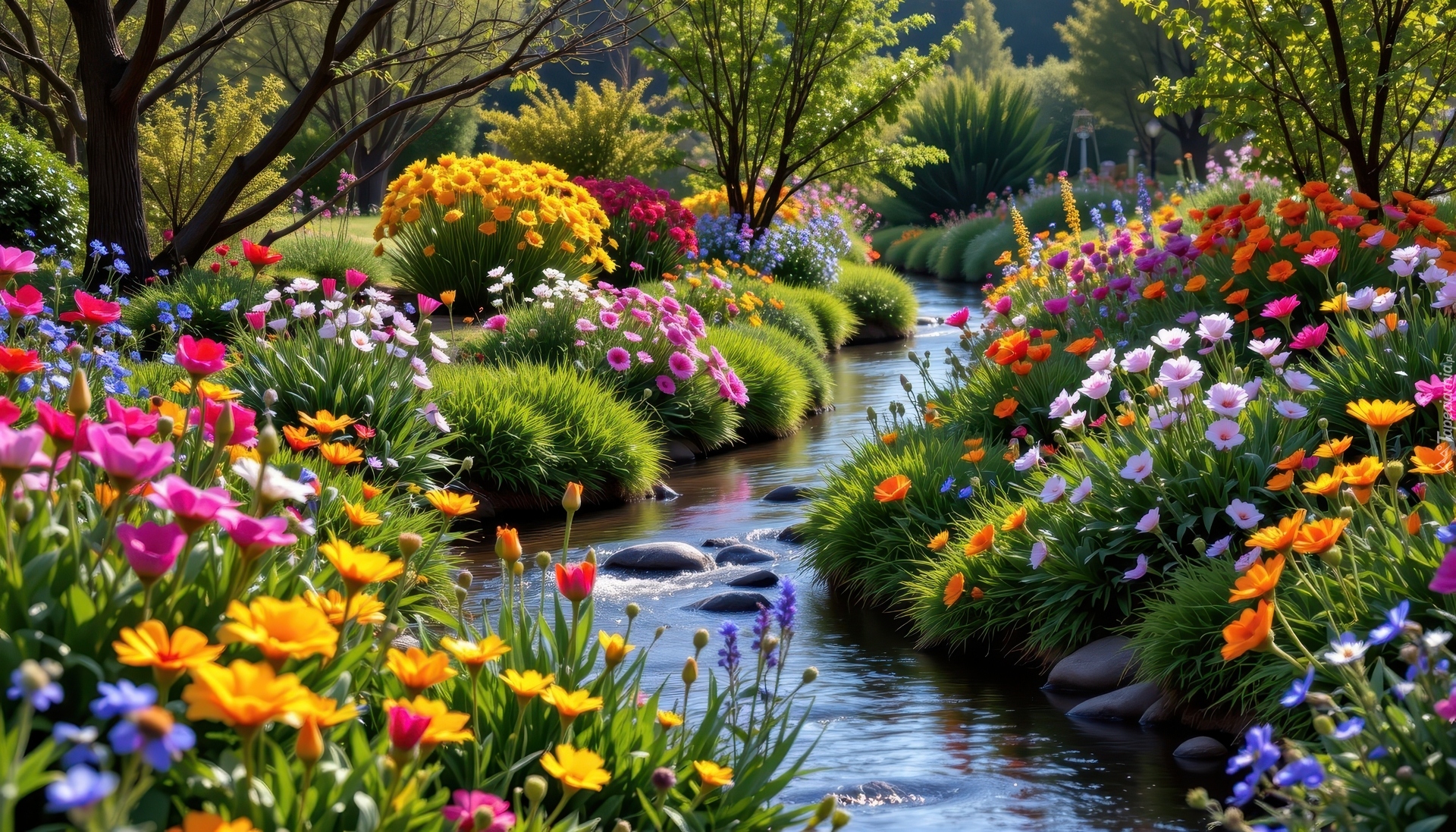 Edytor tapety: Drzewa i kolorowe kwiaty przy strumieniu