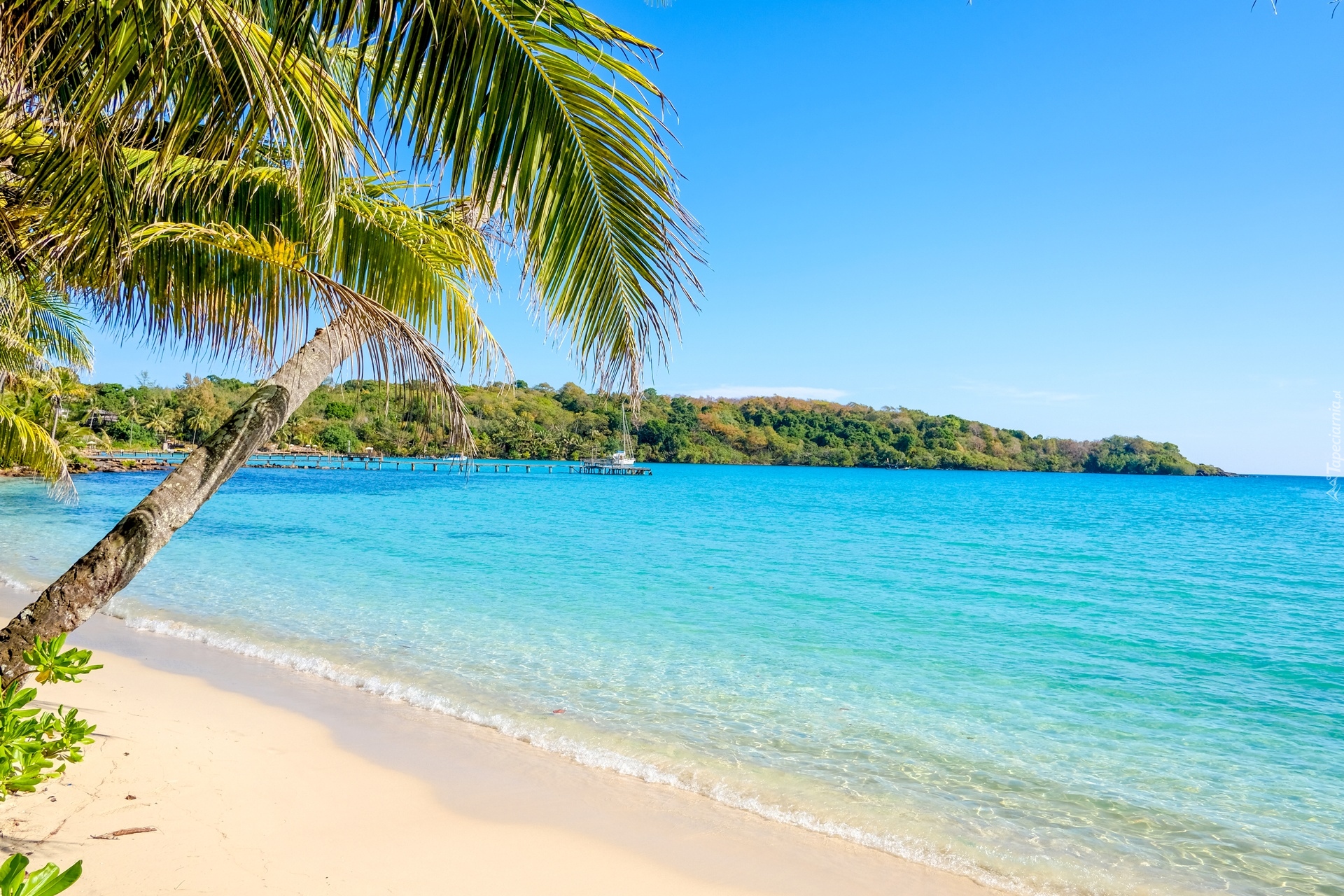 Edytor tapety: Palmy i drzewa nad zatoką morza w tropikach