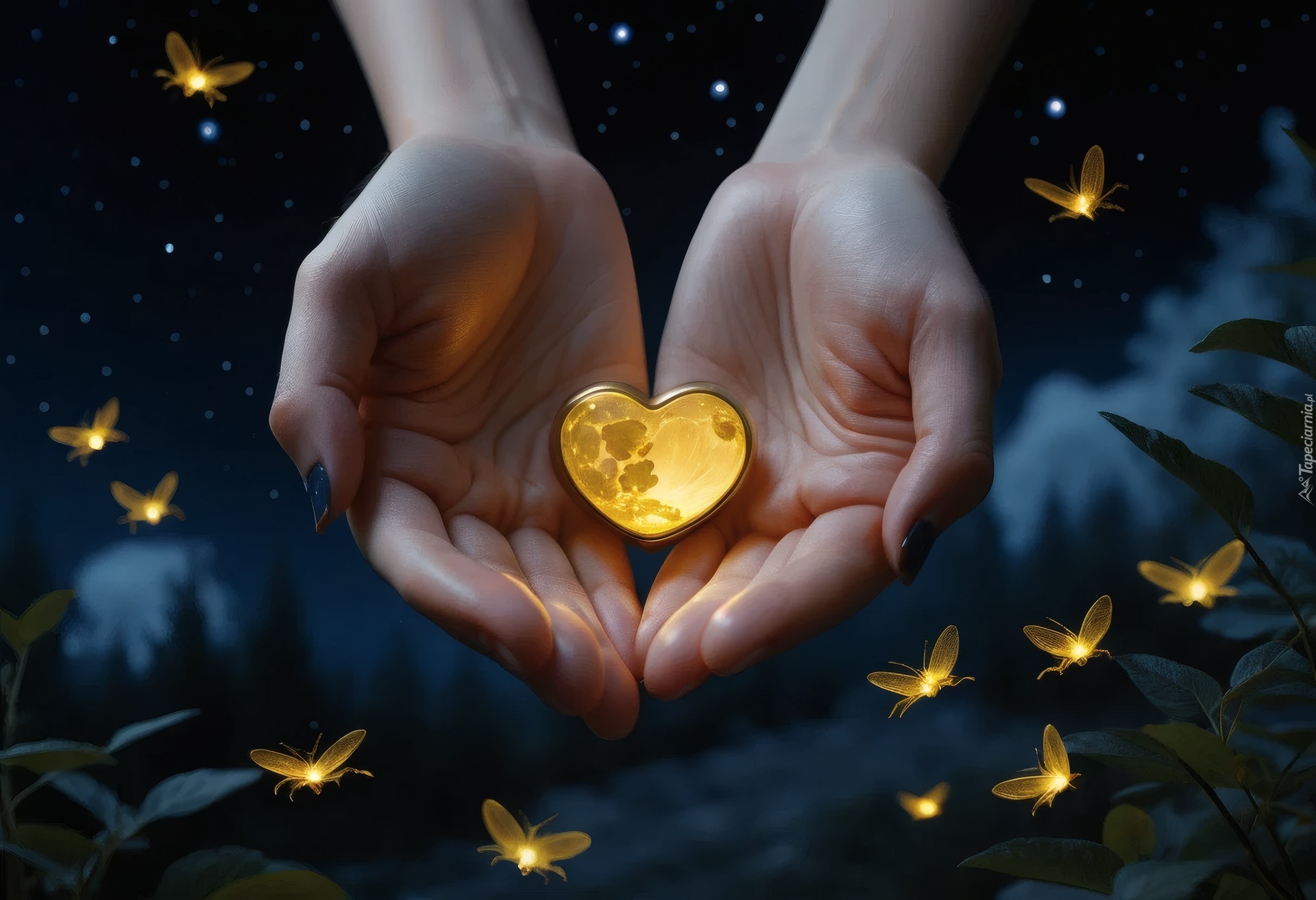 Edytor tapety: Serce w dłoniach i rozświetlone motylki obok