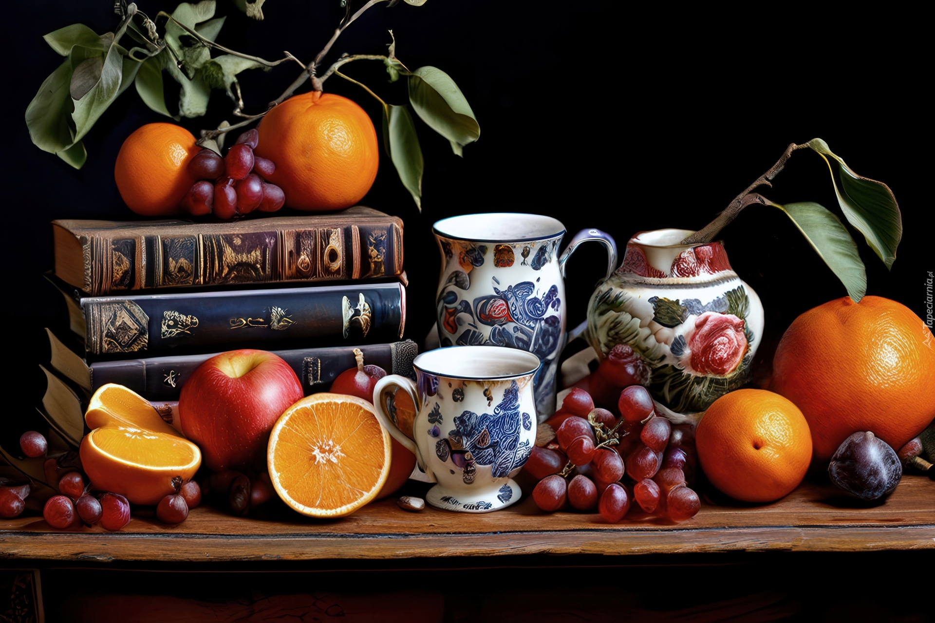 Edytor tapety: Kompozycja z książkami, owocami i serwisem do herbaty
