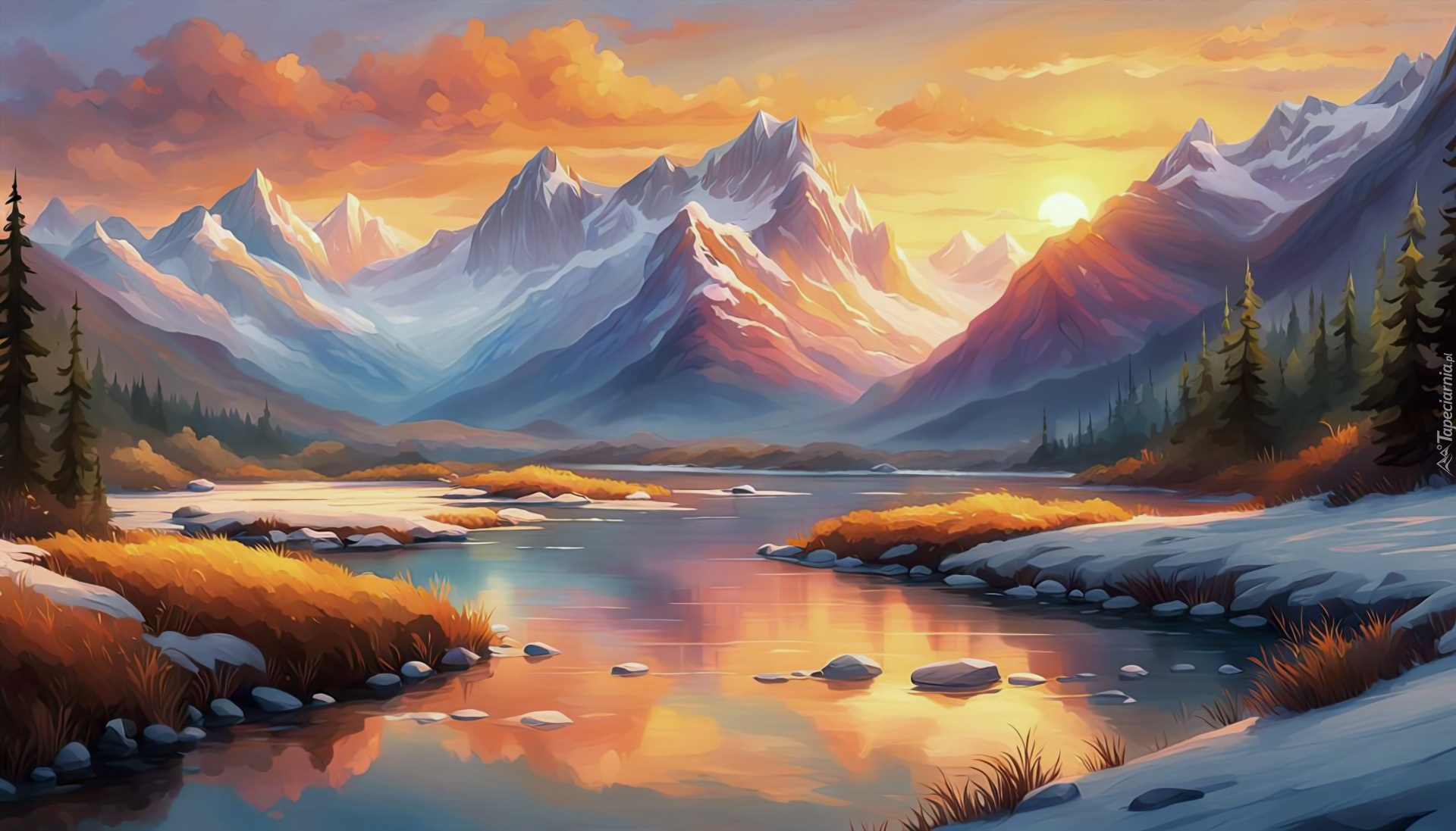 Edytor tapety: Wschód słońca nad ośnieżonymi górami i rzeką
