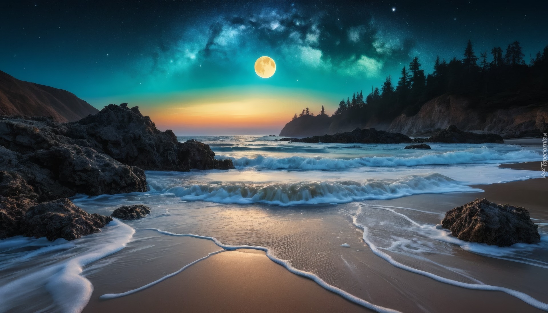 Edytor tapety: Skały i fale na morzu w księżycowym blasku