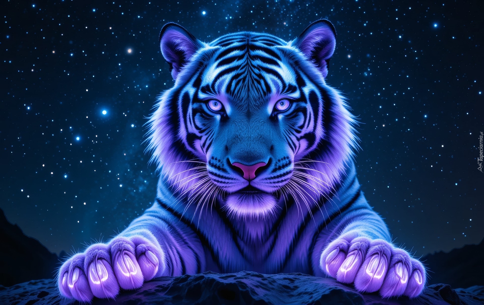 Edytor tapety: Tygrys leżący na skale na tle rozgwieżdżonego nieba