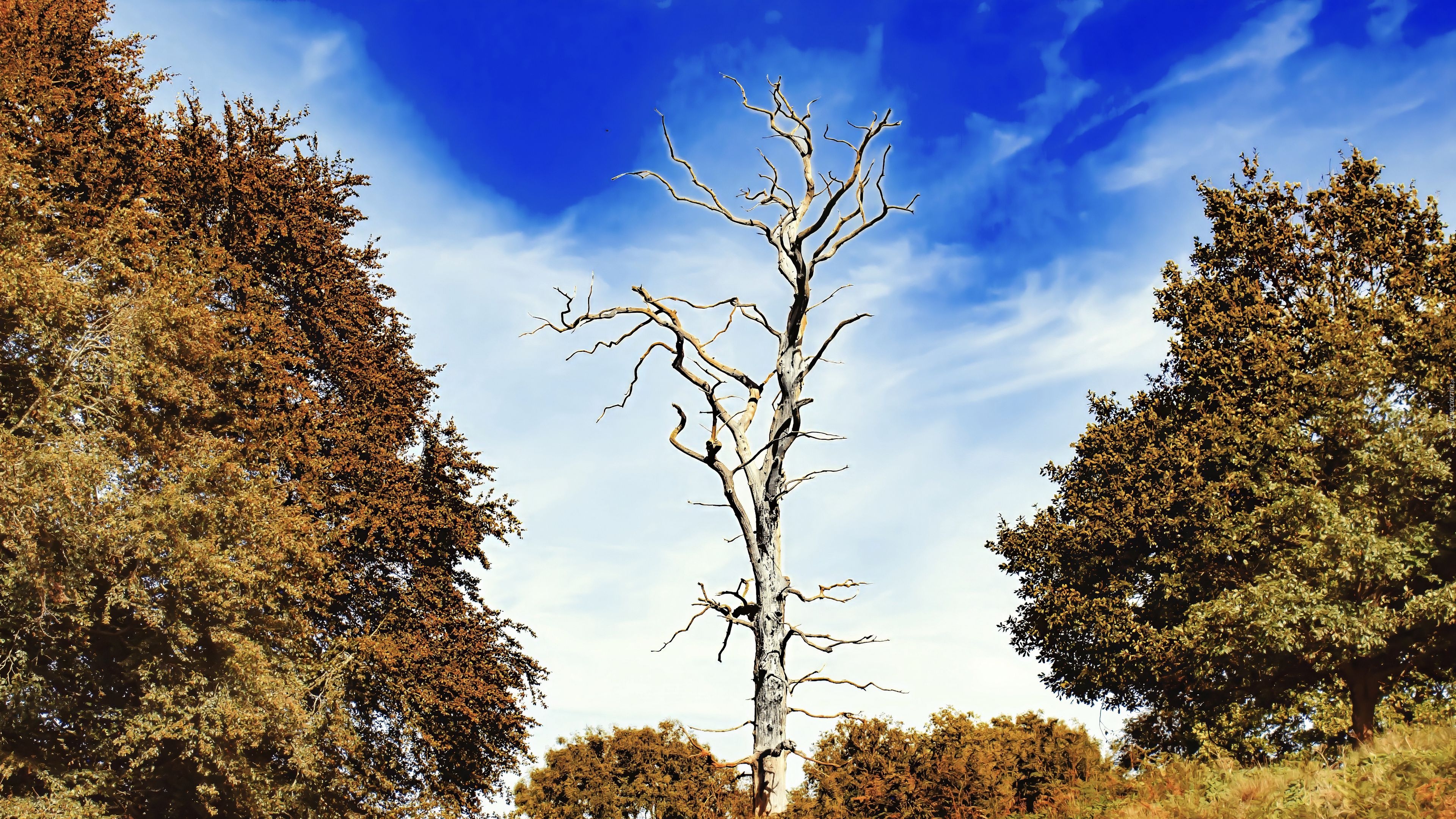 Edytor tapety: Uschnięte drzewo między jesiennymi liśćmi na tle nieba