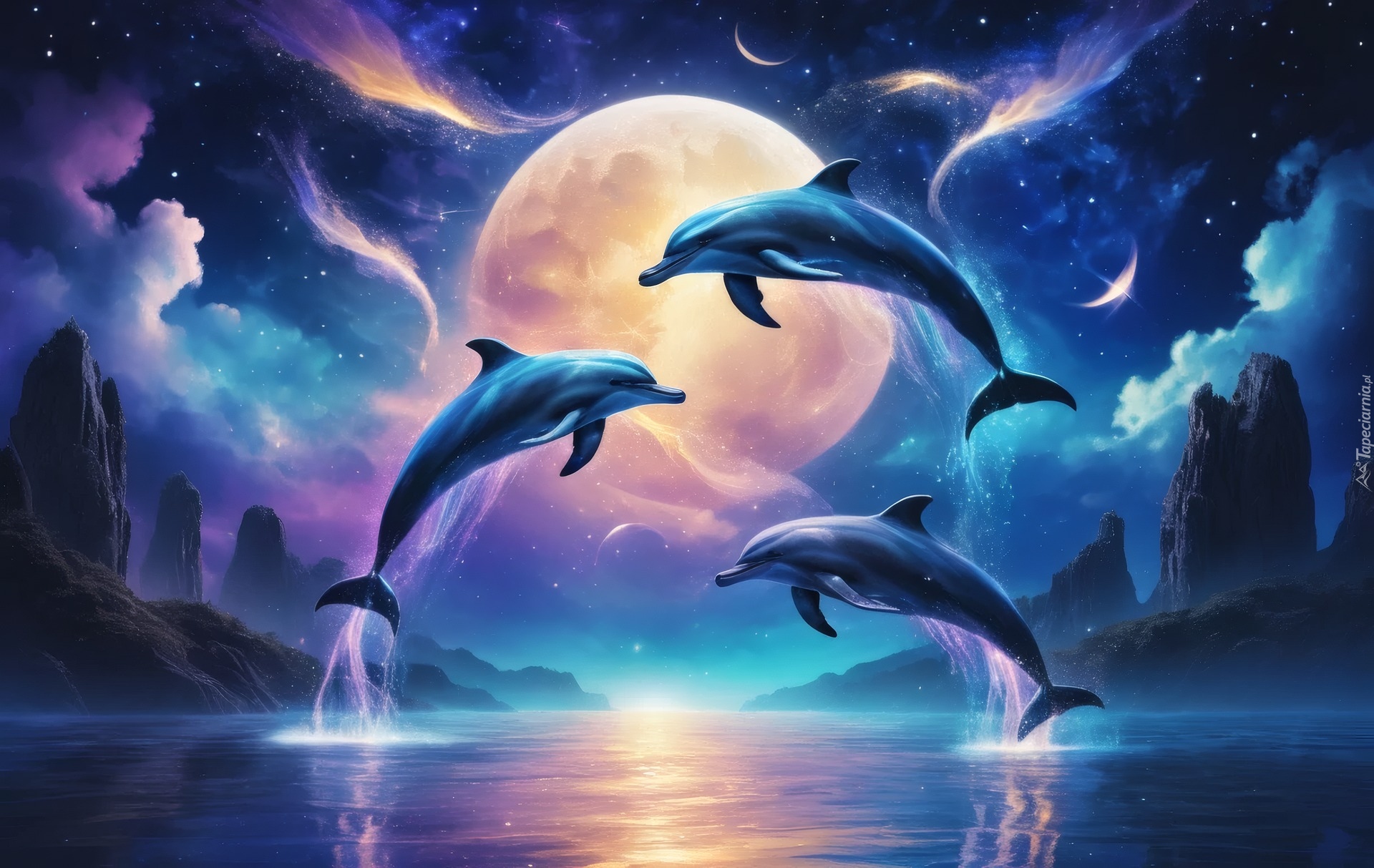 Edytor tapety: Trzy delfiny na tle księżyca