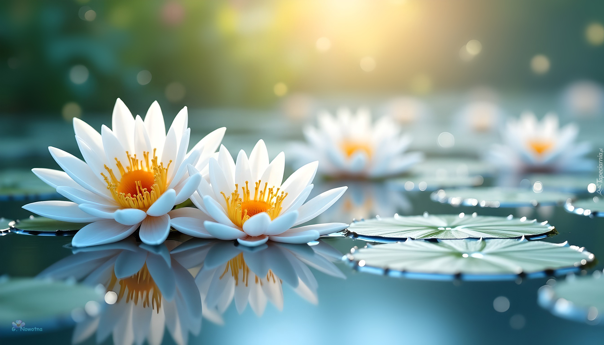 Edytor tapety: Białe lilie wodne i liście w słonecznym blasku