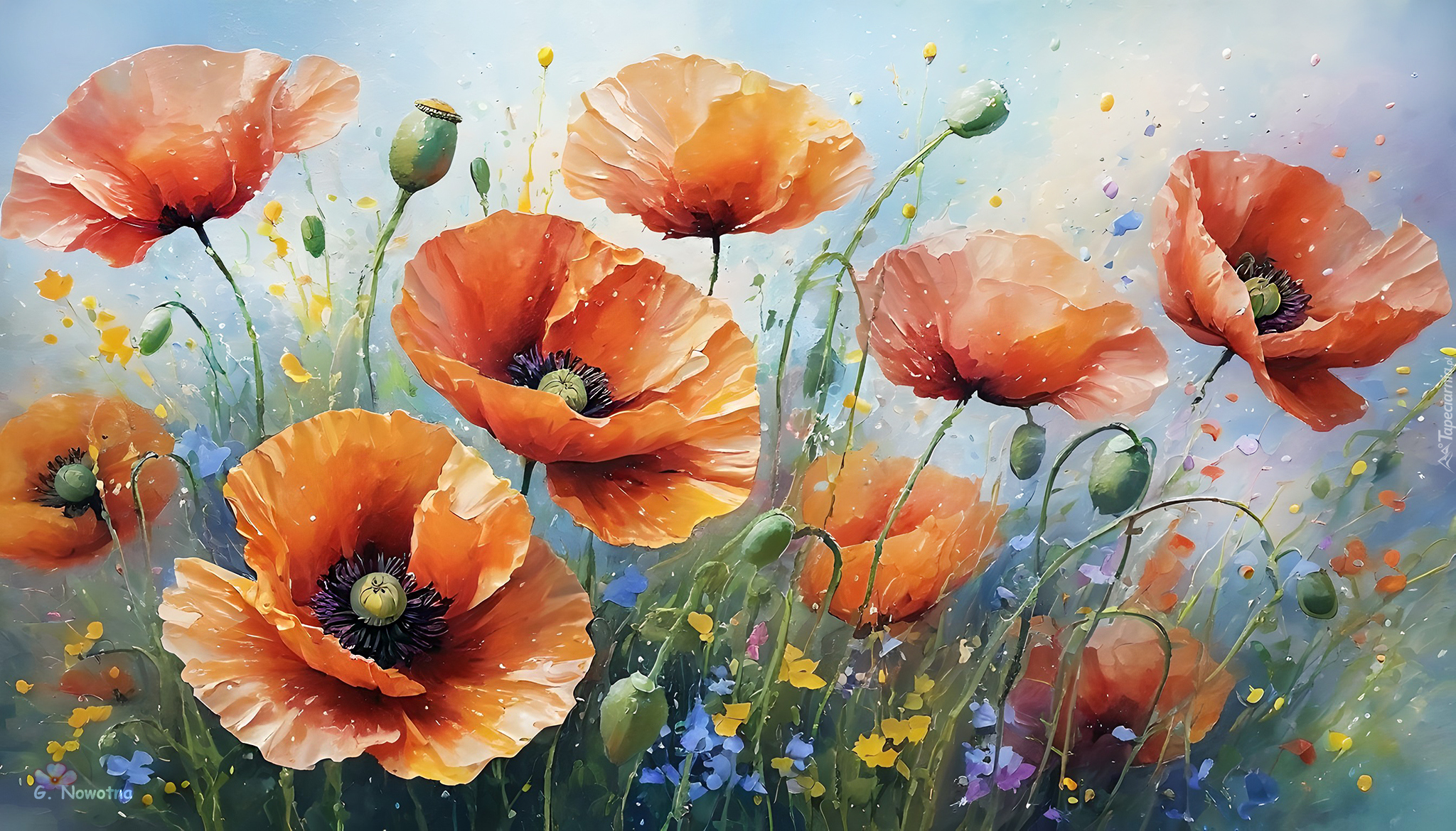 Edytor tapety: Czerwone maki i drobne kwiaty w grafice