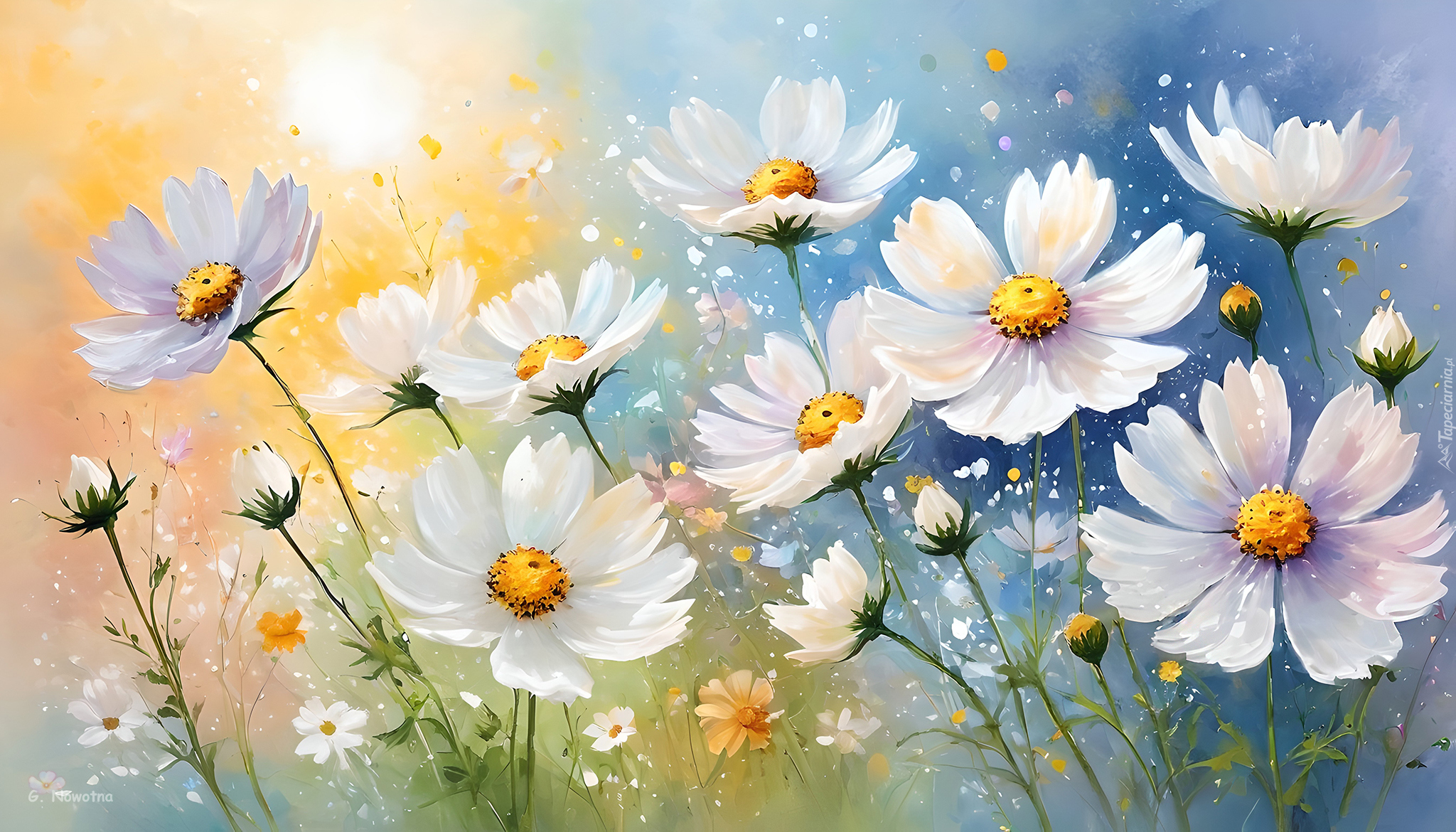 Edytor tapety: Białe kwiaty kosmei na żółto-niebieskim tle