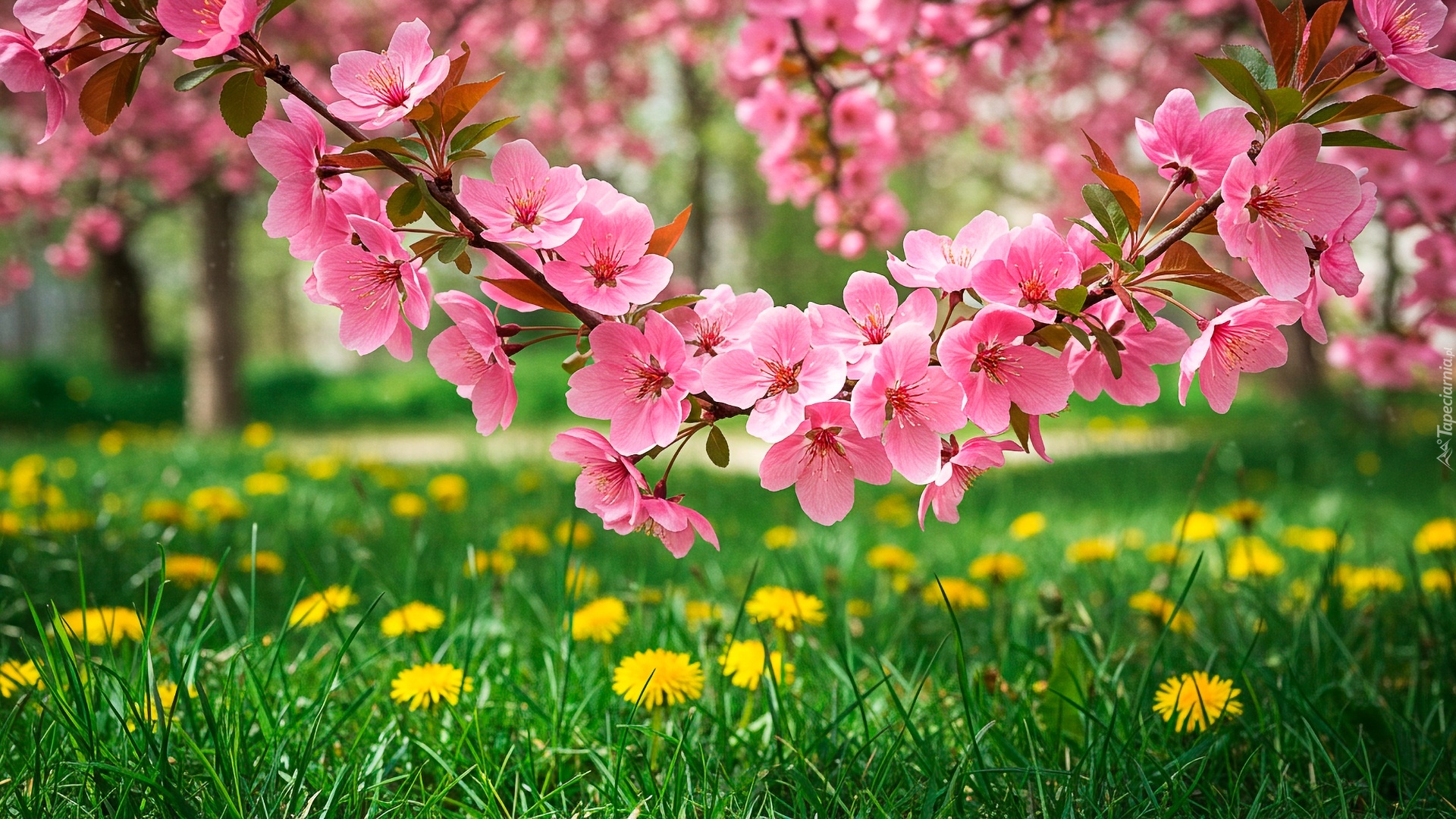 Edytor tapety: Ukwiecone gałązki nad mniszkiem pospolitym w trawie
