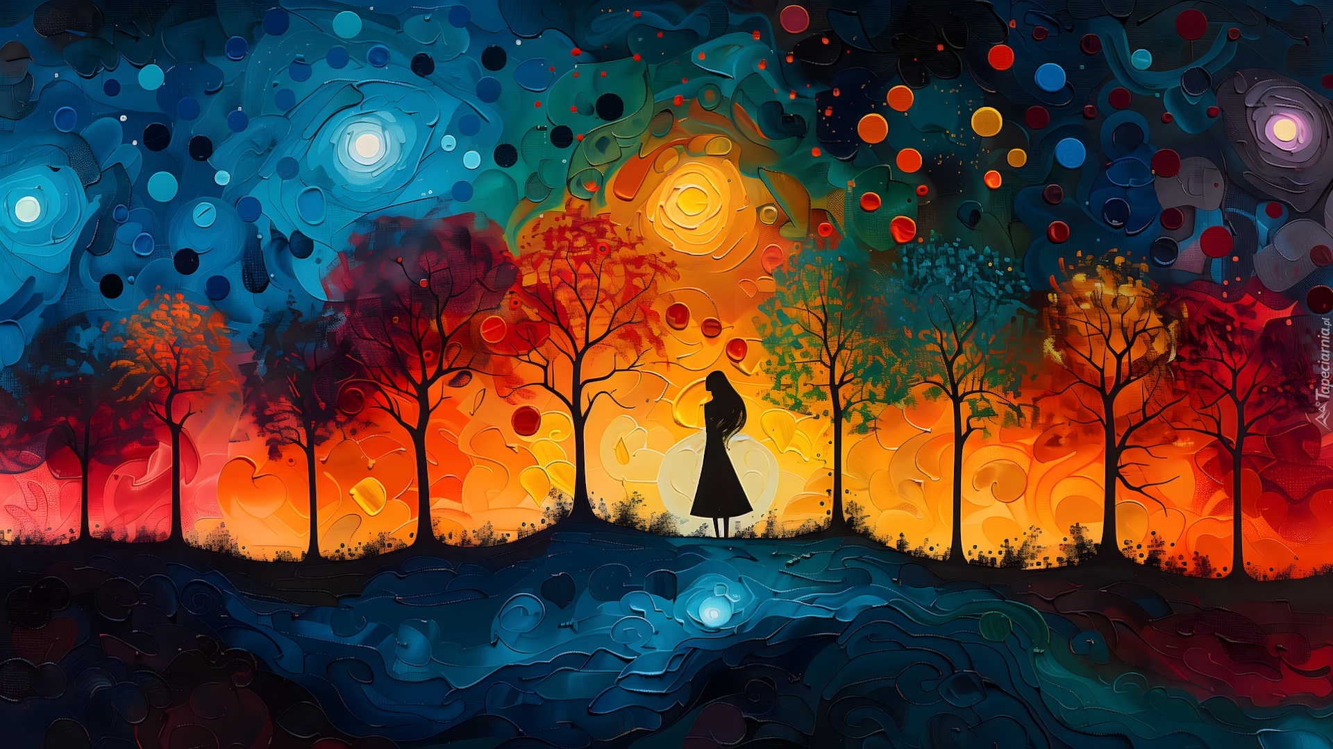 Edytor tapety: Dziewczyna w obrazie graficznym między drzewami