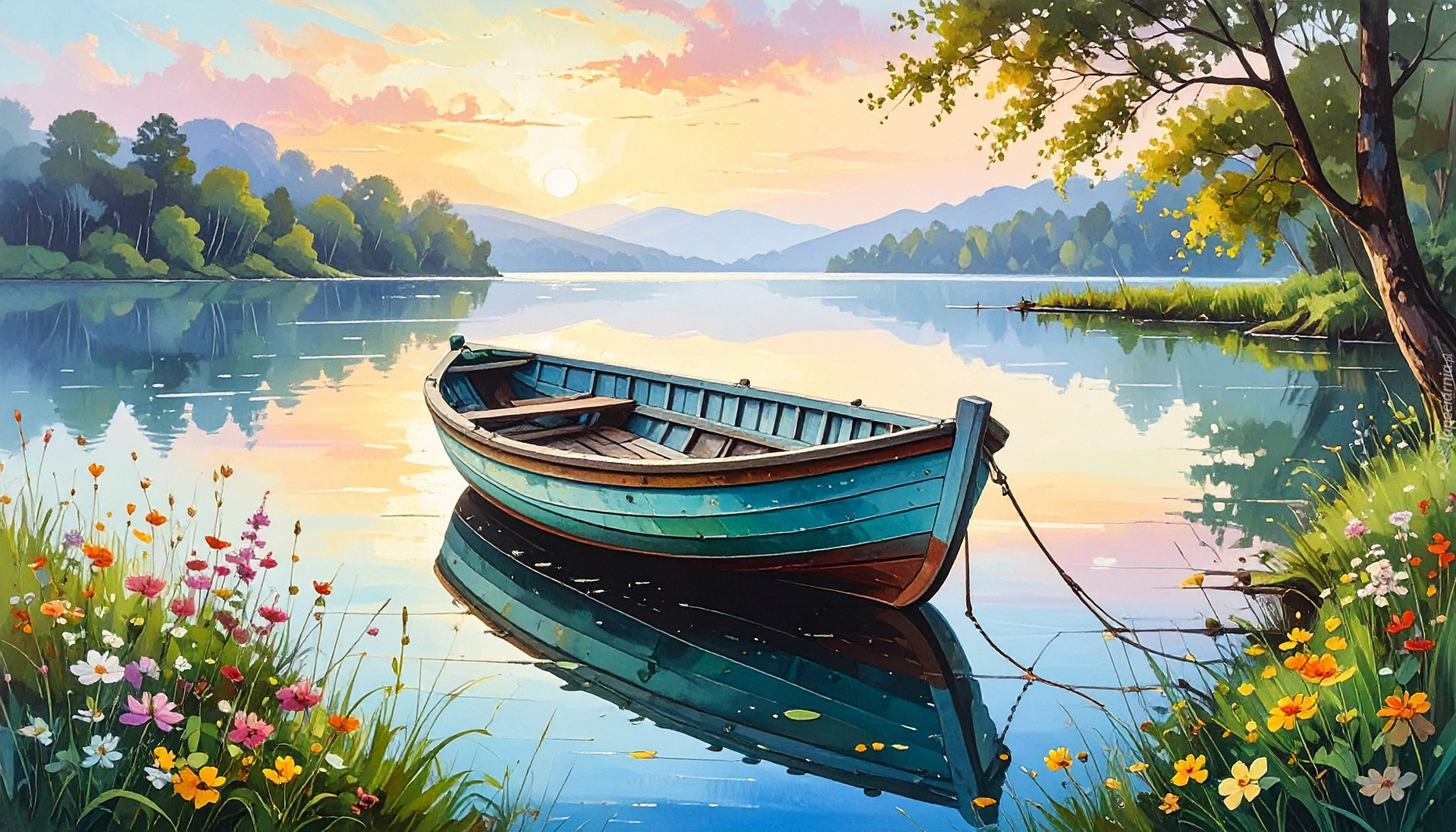 Edytor tapety: Kwiaty i łódka na brzegu jeziora w grafice