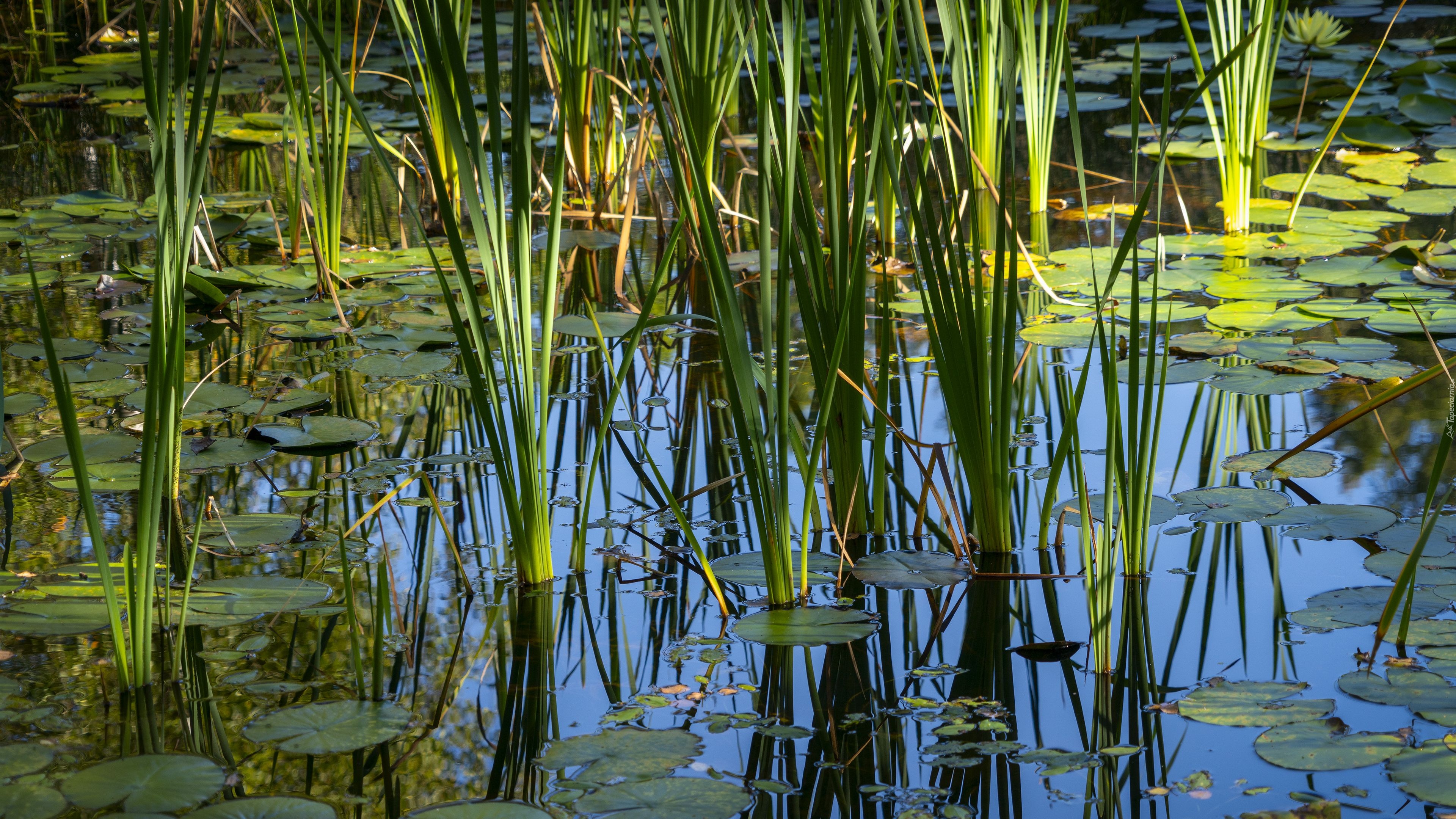 Edytor tapety: Odbicie zielonej trawy w stawie